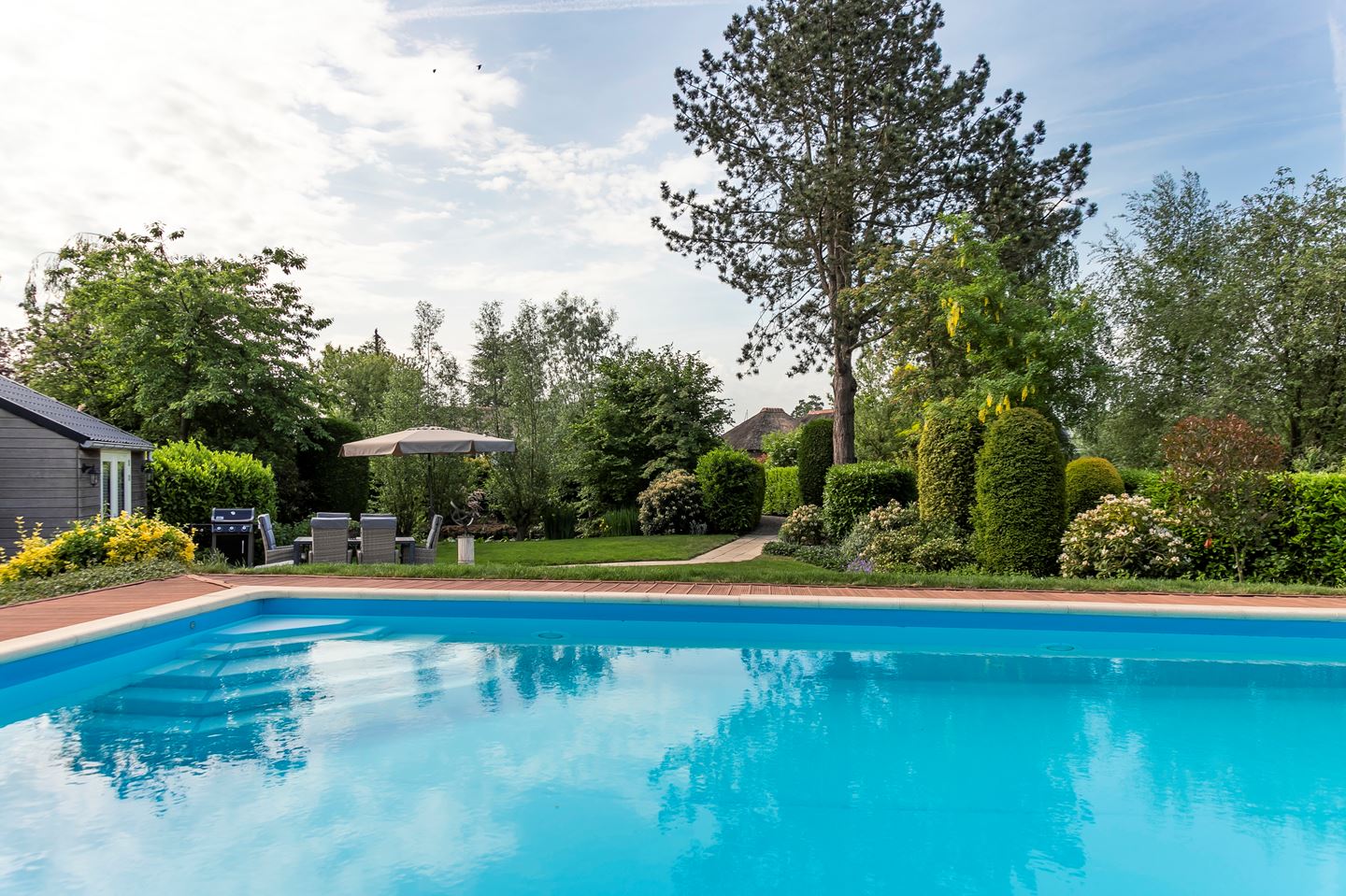 Bij deze locatie draait het uiteraard voornamelijk om het buitenleven, waardoor de lap grond is onderverdeeld in verschillende terrassen en een zwembad helemaal achterin de tuin. En omdat de woning aan het water ligt, is er een stijger aangelegd en een vrijstaande botenloods voltooid.
