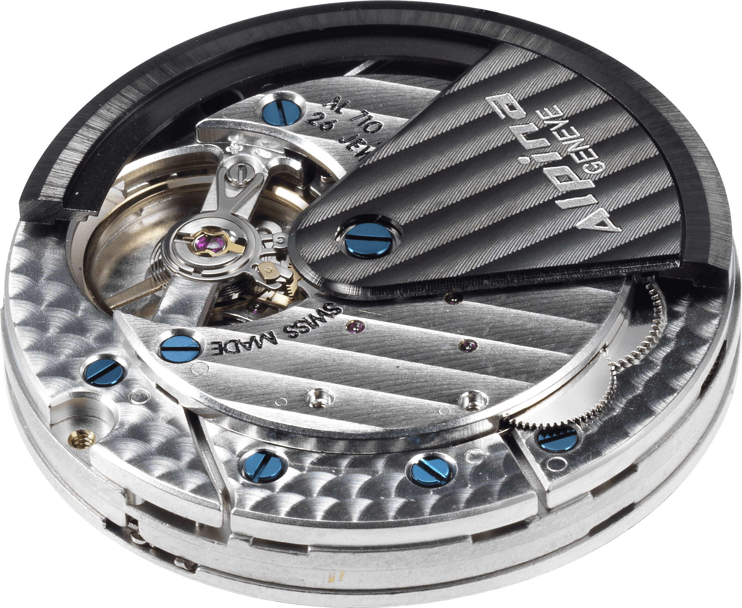 Het in-house AL-710 automatische uurwerk kan als een zeer bijzonder component bechouwd worden. De vorm van de zwart bedekte rotor die heen en weer schommelt, is een onmiskenbare herinnering aan de in 1949 geïntroduceerde rotor van de Alpina 582 Manufacture kaliber. Prachtig gedecoreerd met Côtes de Genève en ronde granulatie, met een diameter van 30,5 mm. Het uurwerk biedt een power reserve van 42 uur.