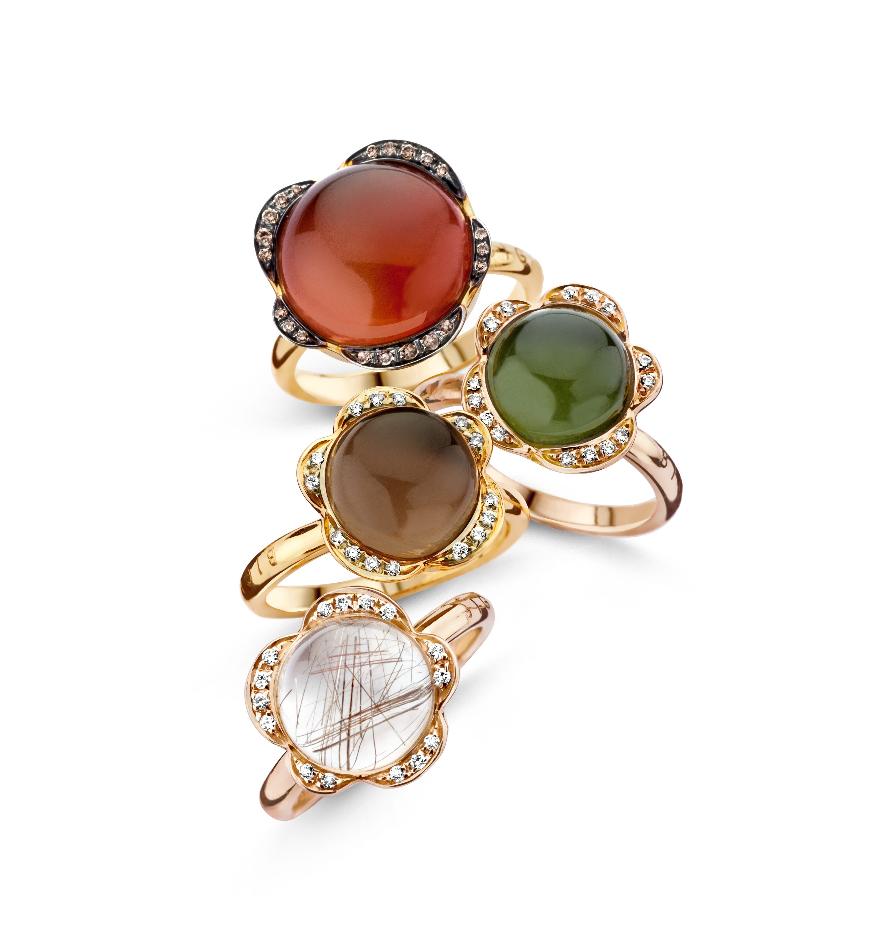 De bloemen zijn als snoepjes zo snoezig, rond en glad. Net als in de natuur – dé inspiratiebron voor deze vrolijke sieraden – zetten tere blaadjes, rond het hart van de bloem, de kroon op het werk. Altijd vijf stuks, bezet met diamanten: witte diamanten voor schittering, karamelbruine diamanten in zwart gerodineerd goud voor flower power met extra rock ‘n’ roll.