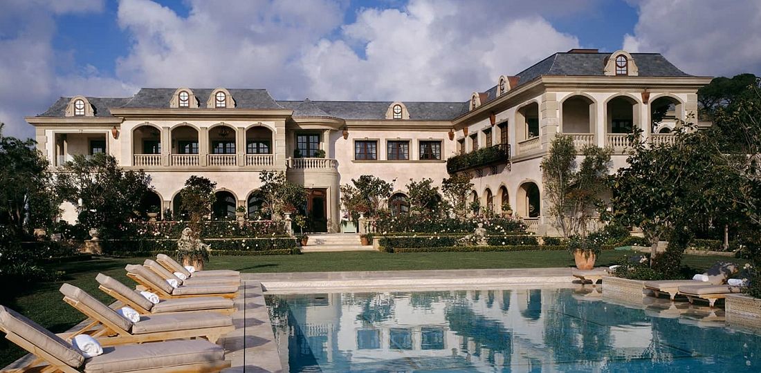 Deze villa, genaamd Le Belvédère, wordt omringt door enorme rozentuinen, fonteinen en beeldtuinen. Het gebouw van 4.460 m2 in Californië is geïnspireerd door een Frans chateau. Dit is ook te zien in het interieur, wat gevuld is met kroonluchters, uitgebreide open haarden en beschilderde plafons. Lees hier meer.