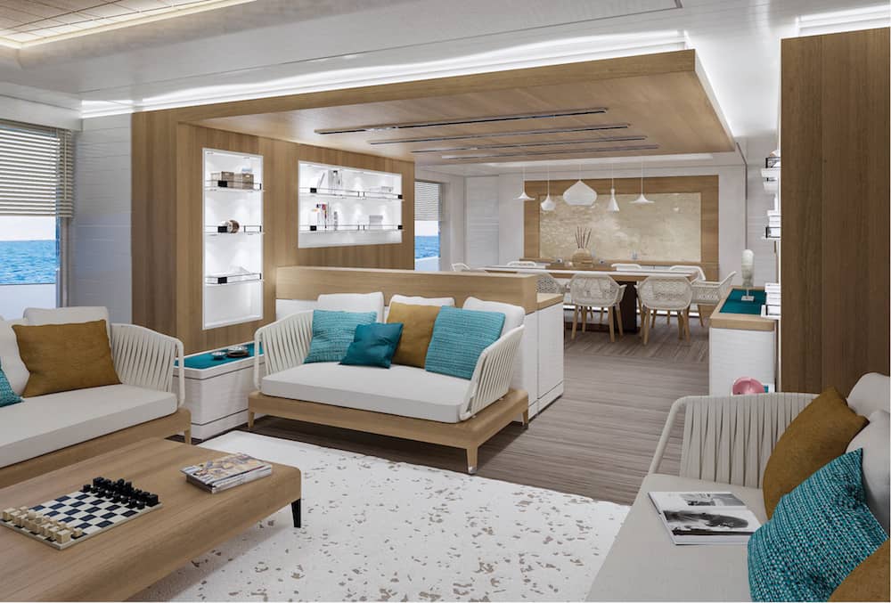 Het interieur is geïnspireerd door de Caraïben met kleuren van zand en het blauwe water. Ook al is deze jacht met 42m niet de grootste ooit, toch is het een ruim, fijn en licht schip waar de eigenaars veel plezier van gaan beleven op de Bahama’s.