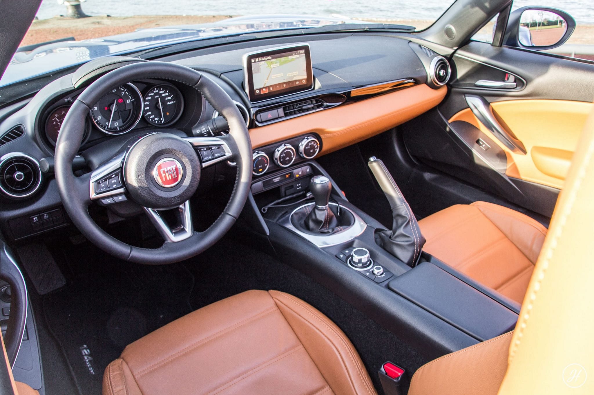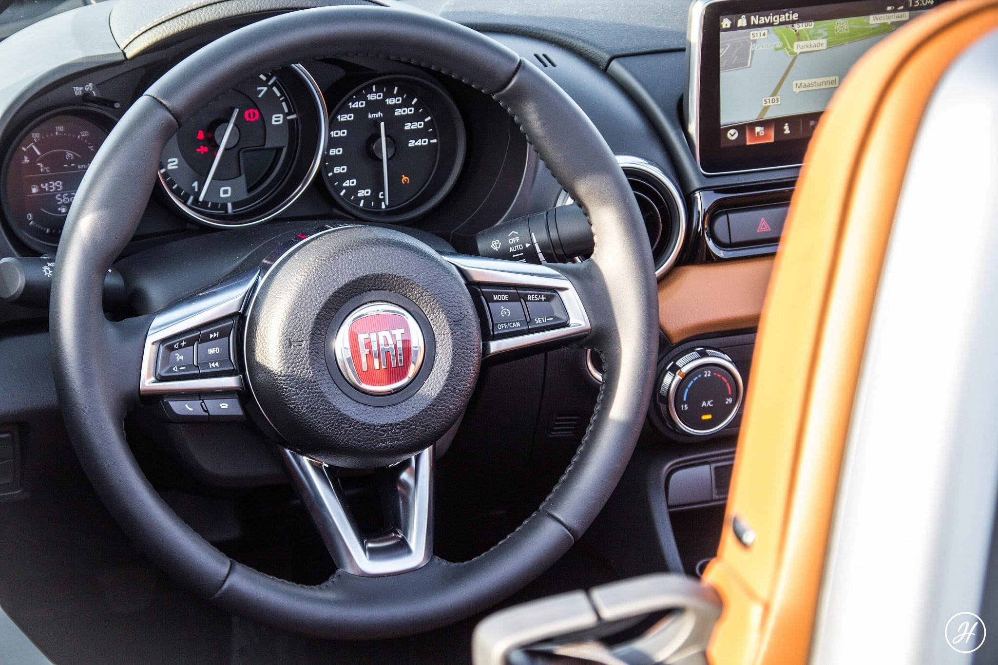 Het is wel even wennen met instappen, want je moet flink door je knieën. Als je eenmaal zit, zit je perfect en heb je direct zin in een potje sturen. De sportieve zitpositie is beter dan die in de Mazda MX-5, want daarin moet je niet te lang zijn. In deze 124 kun je tot 1.90 meter prima plaatsnemen, langere mensen komen vooral met gesloten kap toch in de knel met het dakje. Fiat creëerde deze ruimte door de 14 centimeter langere koets, waarmee ook de bagageruimte met 10 liter groeide naar 140 liter.