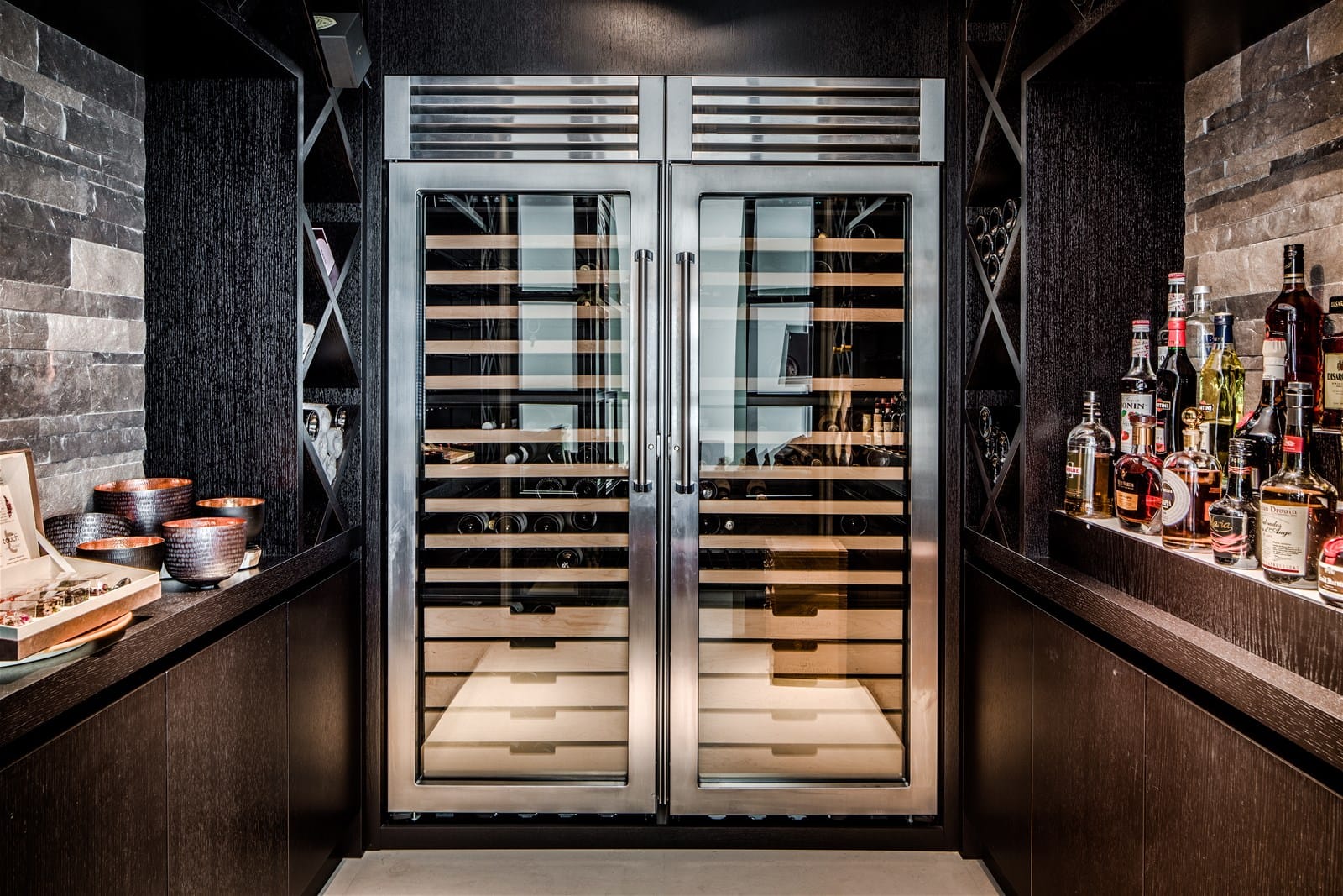 De keuken is voorzien van een imposant kookeiland. In het verlengde daarvan ligt de ingang van de bijkeuken, een ruimte die met de naam ‘bijkeuken’ geen recht gedaan wordt. Het is meer afgescheiden deel van de keuken waar zich de nodige – state-of-the-art – apparatuur bevindt. Naast de bijkeuken – tussen kookeiland en open haard – ligt de ingang van een ruimte die zich wellicht het best laat omschrijven als een ‘walk-in-closet’ voor drank en wijn. In deze ruimte bevindt zich ook een wijn-klimaatkast.