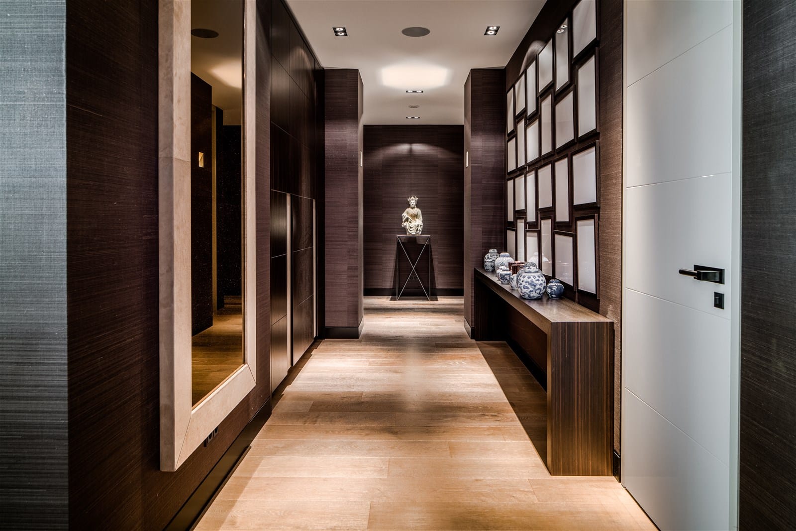 Terug naar de gang via de dubbele verdiepingshoge deuren. Halverwege de gang een ‘kruispunt’ met een tweede gang die de links en rechts gelegen kleedkamer, slaapkamers, badkamers en het gastentoilet ontsluit. Daarbij ligt het gastentoilet – heel doordacht – op het kruispunt van de twee gangen. Ook de andere vertrekken zijn optimaal in het penthouse gesitueerd, waarbij de slaapvertrekken aan de koele noordkant liggen.