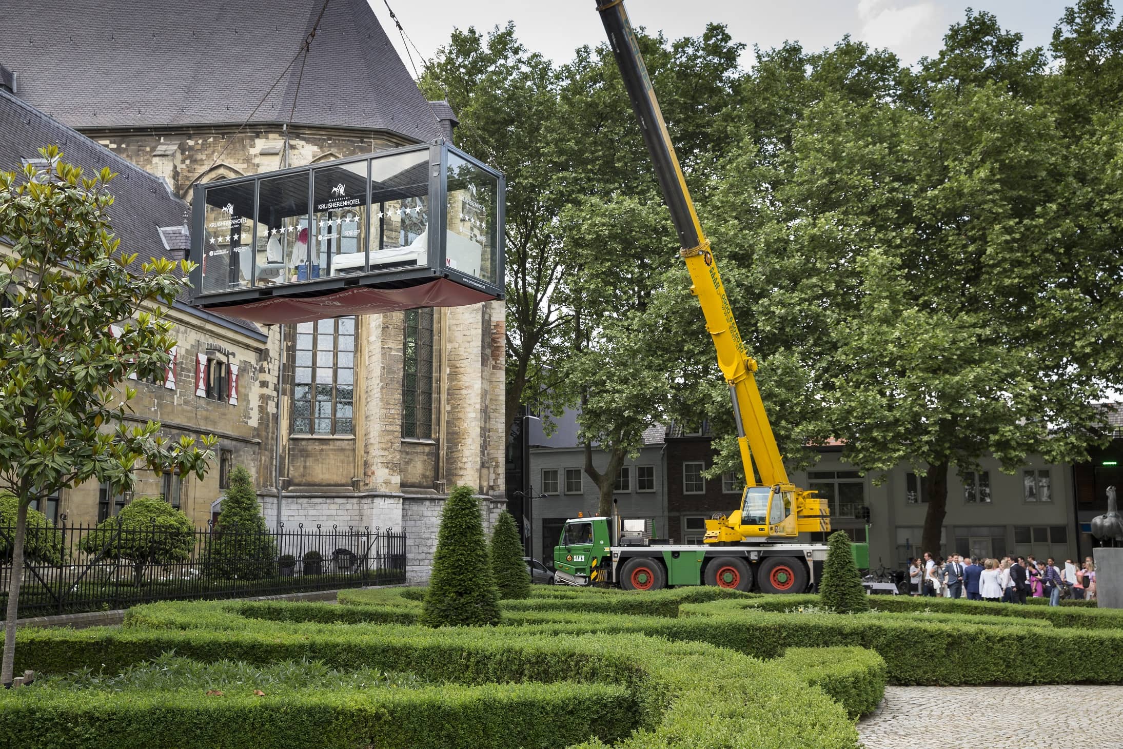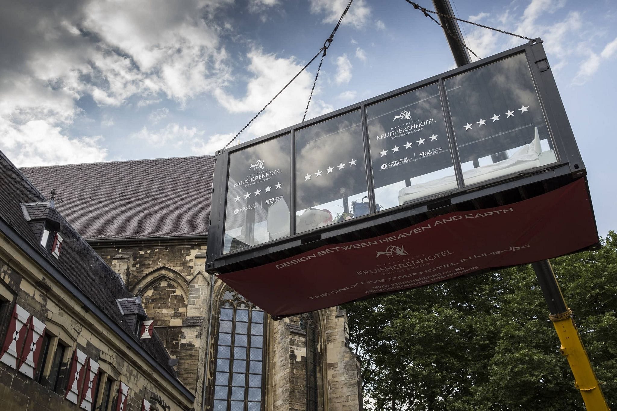 Tijdens de borrel werd er een doorzichtige container, met daarin de designproducten die kenmerkend zijn voor het hotel, zoals het Auping Essential-bed, boven het Kommelplein getakeld. Een spectaculair gezicht waarmee symbolisch het motto van het Kruisherenhotel werd uitgebeeld: ‘Design Between Heaven and Earth’. Bastiaan Klomp, Directeur/Gastheer: “Kruisherenhotel Maastricht staat al 11,5 jaar voor vijfsterrenservice. Het is een prachtige waardering dat we nu die vijfde ster formeel mogen voeren. Met deze strategische mijlpaal voegen wij een nieuw hoofdstuk toe aan het bestaan van het Kruisherenhotel en gaan wij goed voorbereid de toekomst in”.