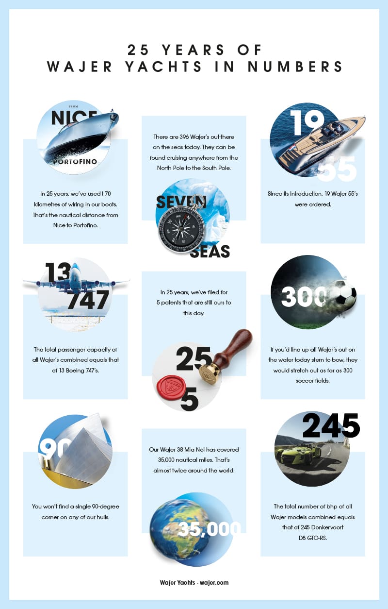 In 25 jaar tijd is Wajer Yachts uitgegroeid van een eenmanszaak tot een gerenommeerde speler in de internationale wereld van luxe jachten. De Wajer waar het allemaal mee begon, de kapiteinssloep, is nog steeds in productie. Maar het bedrijf heeft zijn naam vooral gevestigd met krachtige, luxe open-dag boten voor gebruik op zee. Inmiddels zijn er 396 schepen verkocht en varen er Wajers over de hele wereld, van Ibiza tot Hong-Kong.