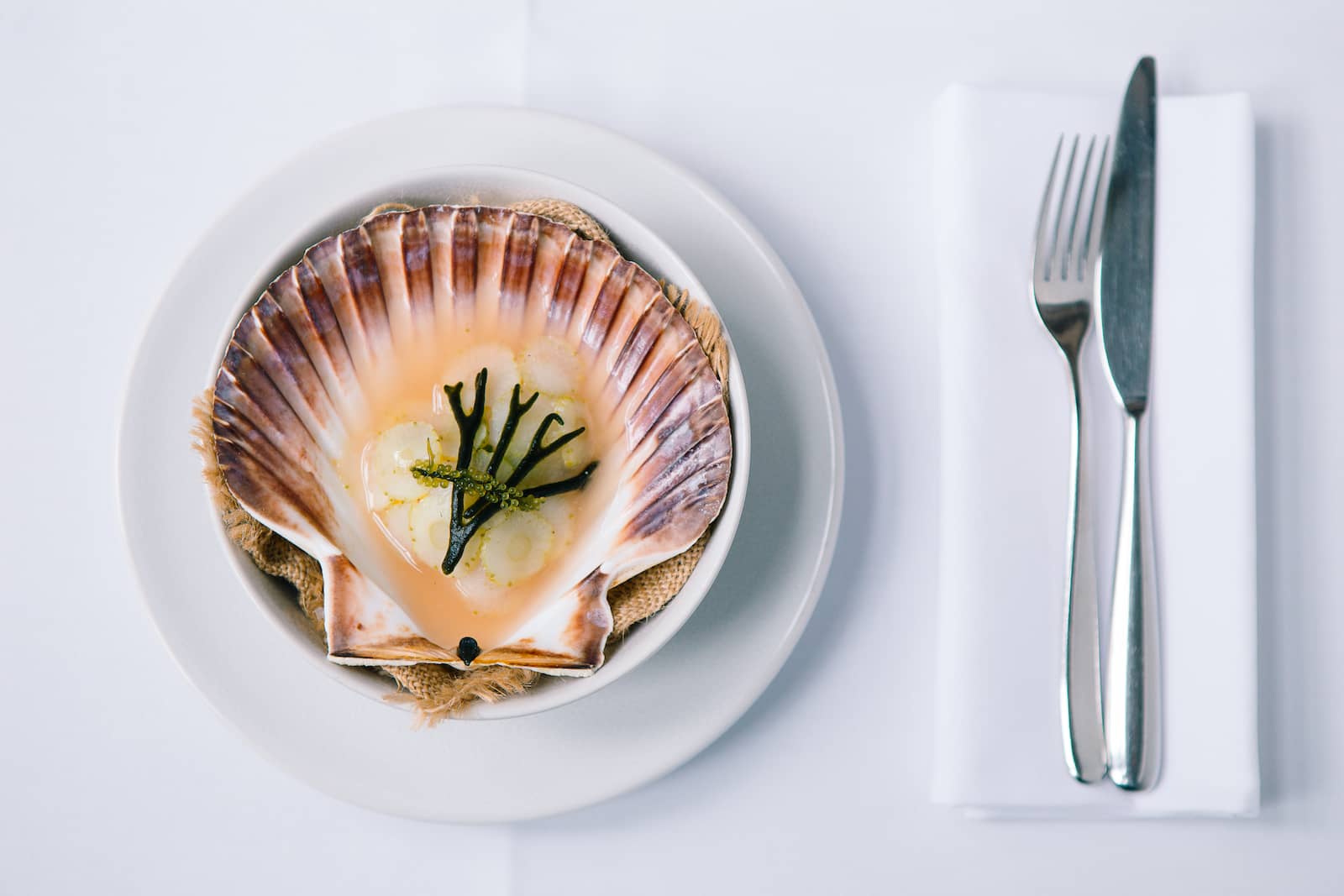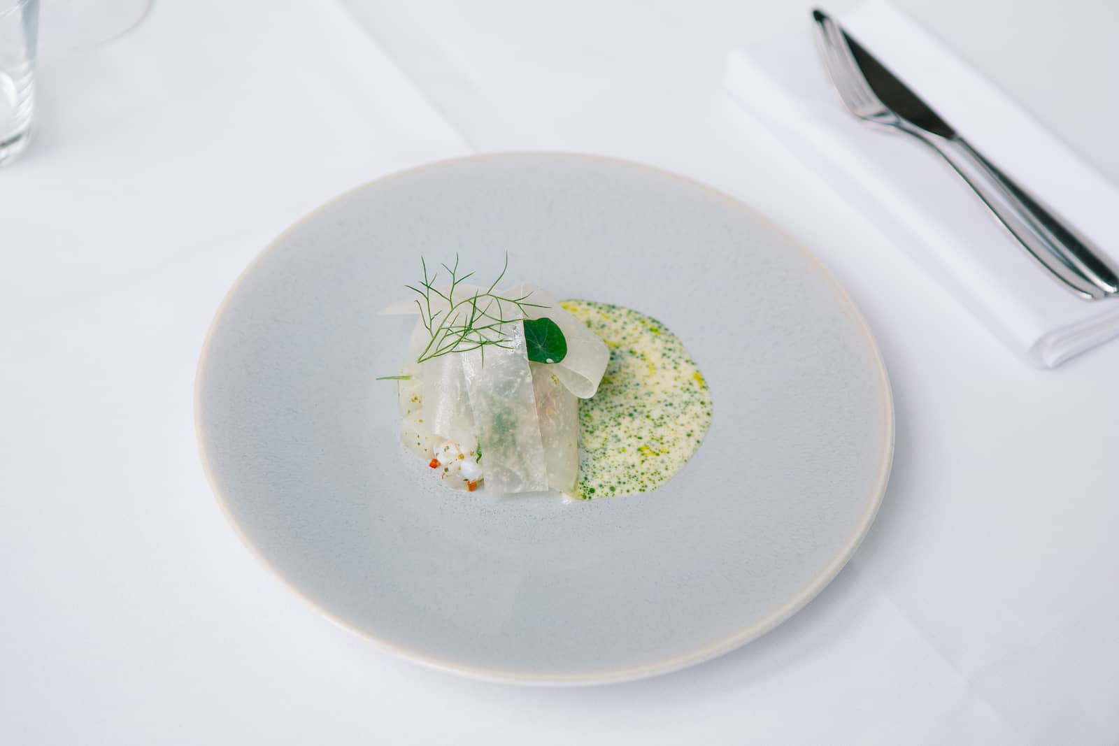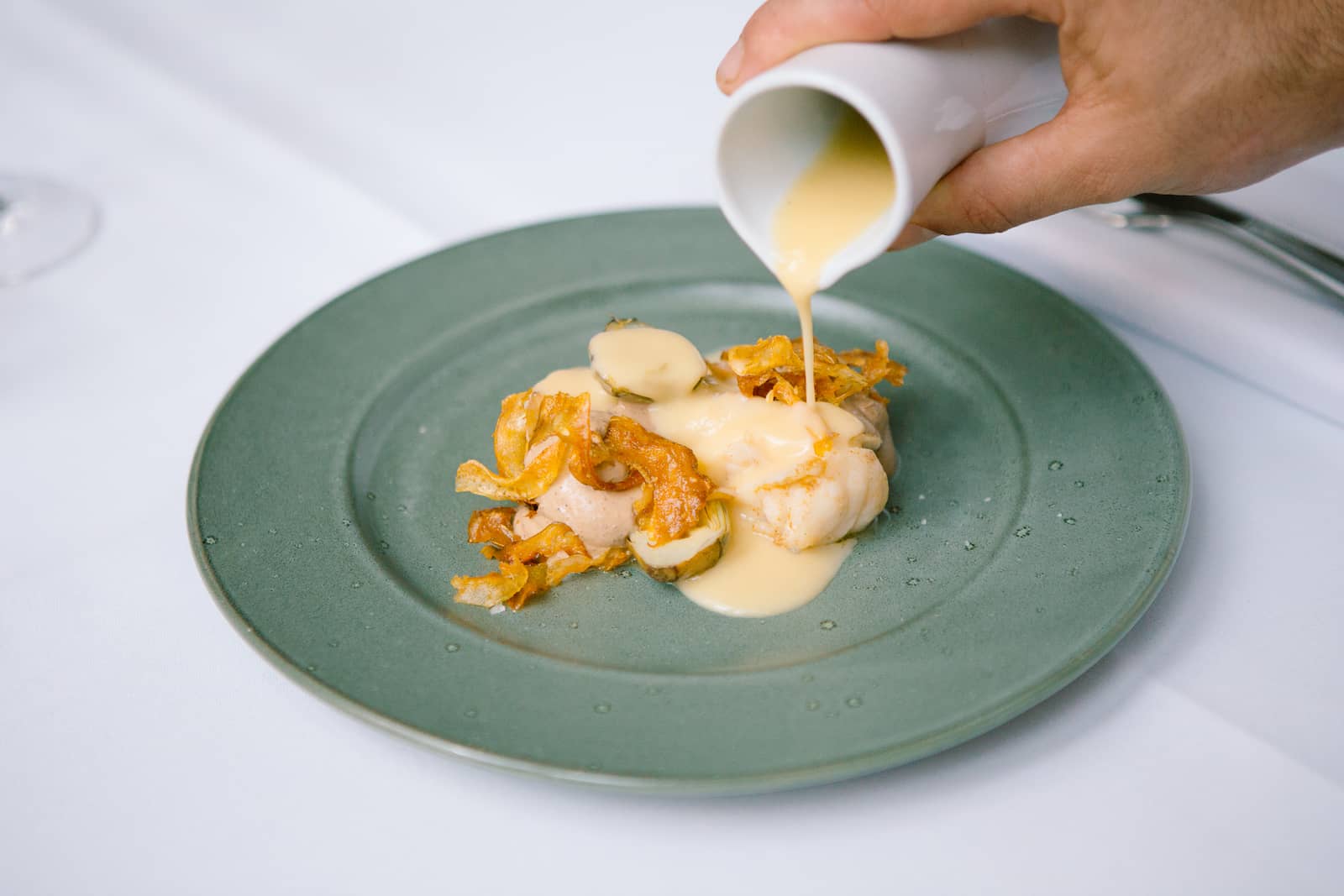De tweede gang wordt ingezet. Een waar fotomoment, onze telefoons gaan simultaan omhoog. ‘Sint Jakobs mosselen met Oestercrème, groene aardbei en Willem’s Wermoed vermout’. De hand-gedoken, dungesneden coquille wordt opgediend in zijn eigen schelp met een dressing met als basis Nederlands eerste witte vermout. Hier drinken we een Delamotte Blanc de Blancs champagne bij. Dit is voor mij de perfecte combinatie. Deze Blanc de Blancs is als een prachtige Bourgogne. Blanc de Blancs wordt gemaakt van 100% chardonnay druiven uit de Grand Cru wijngaarden van Delamotte en rijpt vier tot vijf jaar. De Blanc de Blancs is licht mineralig en zacht van mousse, met tonen van fris wit fruit en citrus.