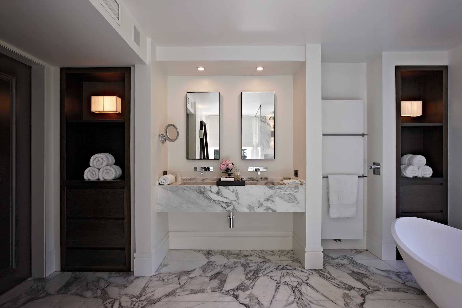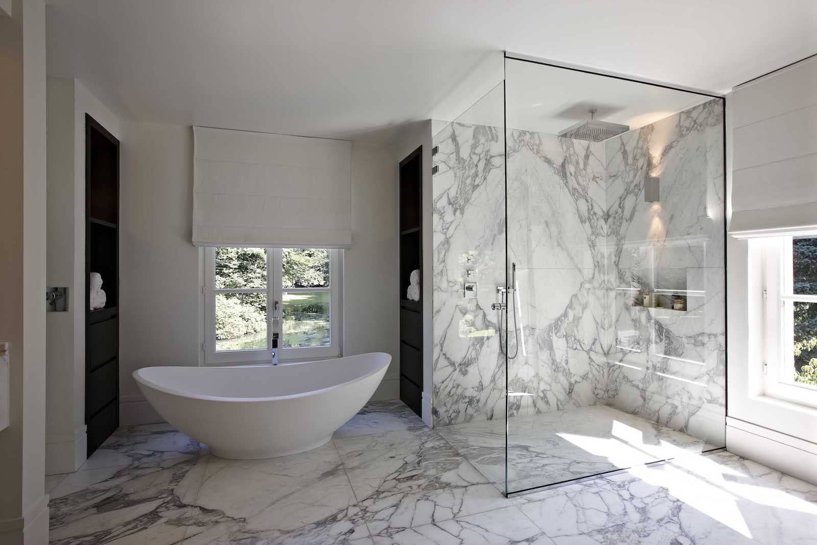 In de master bedroom, helder wit met contrasterende dubbele deur, valt het daglicht meteen op het grote bed. Geen parket hier, wel aangenaam kortpolig kamerbreed tapijt dat een warme sfeer oproept. Nieuwe verrassing: de badkamer met het erg chique Carrara-marmer dat voor de vloer in boekvorm is gelegd. Pure klasse, geaccentueerd door de grote inloopdouche met glazen wanden en het super moderne bad. De ingewerkte kasten komen in een donkere tint die verwijst naar het patroon in het marmer.