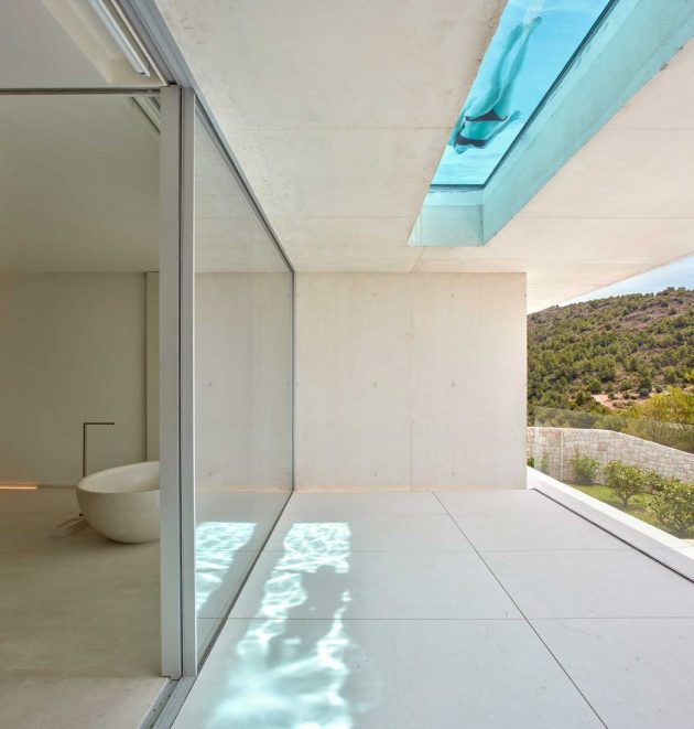De bovenste verdieping wordt benoemd als ‘dagruimte’; een open ruimte met spectaculair uitzicht en zeer licht, waar de woonkamer, de eetkamer en de keuken plaatsvinden. Een toilet, de lift en het spectaculaire terras, waartoe toegang is vanuit elk van de ruimtes, maken deze verdieping compleet. Het terras is voorzien van een buitenhaard en een infinity pool met transparante vloer die zijn reflecties projecteert op de benedenverdieping.