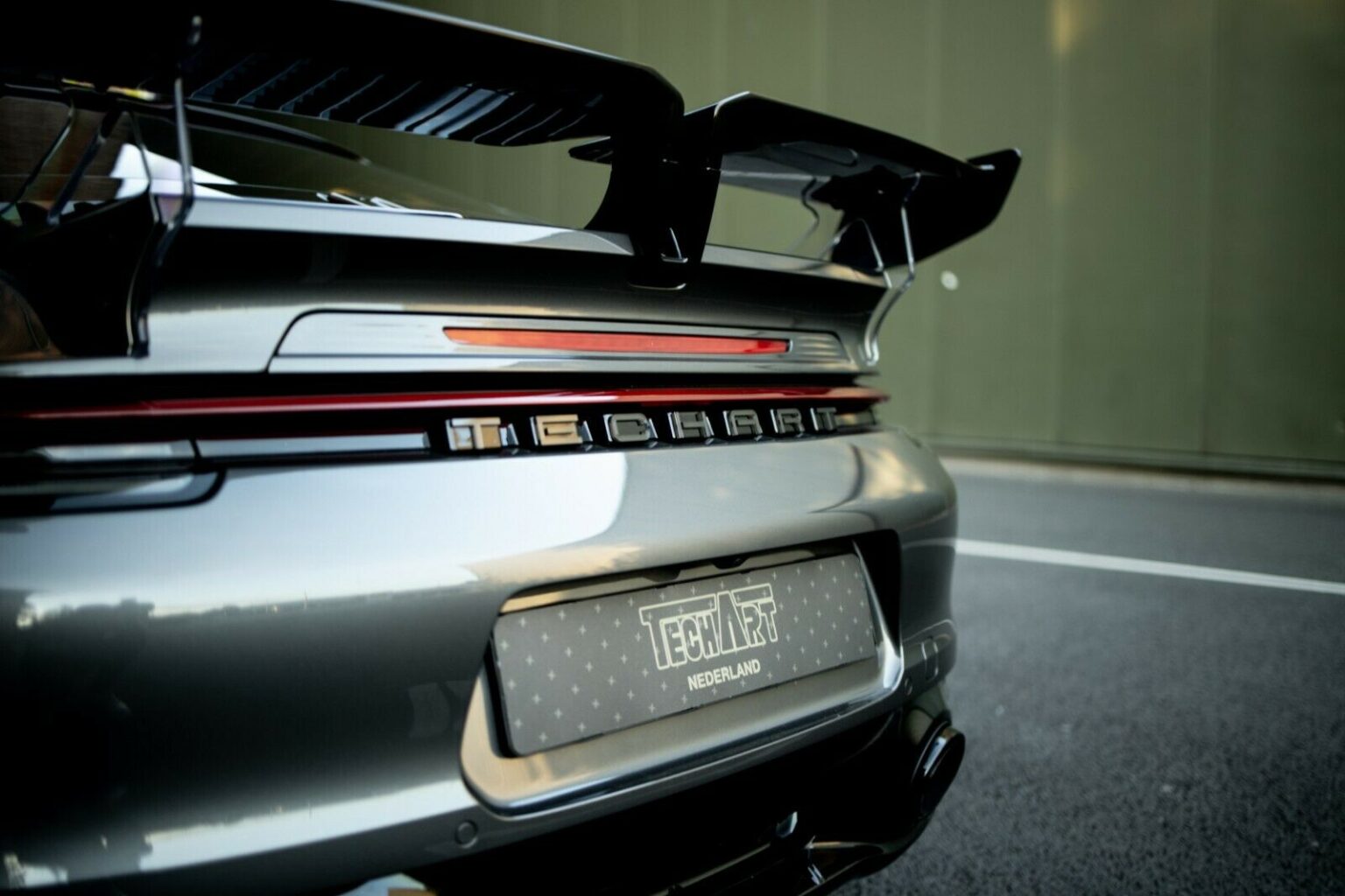 Er is een manhaftige bodykit op deze TechArt 911 gemonteerd. Met ‘n opvallende en kenmerkende spoiler, skirts, splitter en en dakspoiler. Voor een betere stance zit er een TechArt sportonderstel onder, waardoor de 992 nog even wat lager op de grond ligt. Qua interieur zijn er speciale sportpedalen in gemonteerd en een sportstuurwiel.