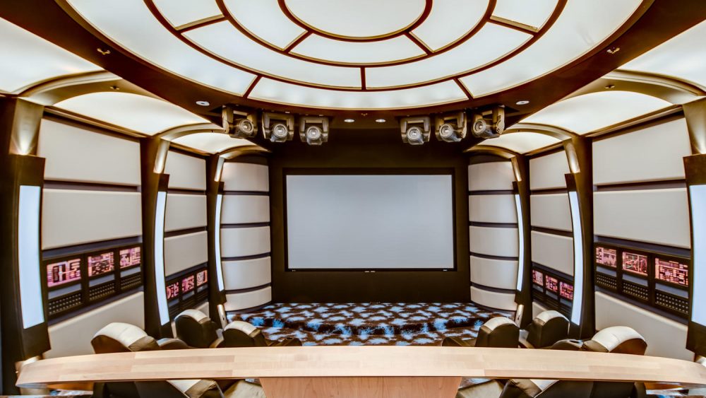 Beneden is er een unieke bioscoop: een bioscoop geïnspireerd op Star Trek, compleet met gloeiende schijnbedieningspanelen langs de wanden. De stoelen zien eruit als die van Captain Kirk, compleet met het logo van The Enterprise, en zijn in staat om te bewegen en te synchroniseren met de acties die op het scherm worden getoond. Een wijnkelder en een proeflokaal zijn ook beneden, evenals een volledig uitgeruste salon die geschikt is voor kapsels, blow-outs, manicures en pedicures.