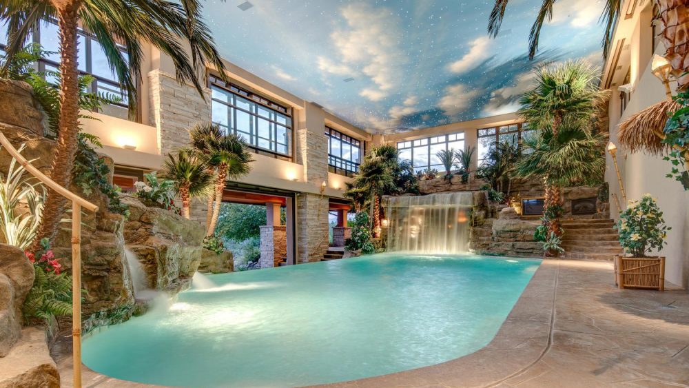 Gelegen in de kleine gemeenschap van Evergreen, slechts 30 minuten buiten Denver, heeft het zeven-bed, 14-bad huis genoeg eigenzinnige voorzieningen. Het belangrijkste is het binnenzwembad in grottestijl op de hoofdverdieping, dat de vorige eigenaar, voormalig raceautobestuurder Richard Berry, gemodelleerd naar Hugh Hefner’s beruchte drinkgat-Tiki-bar en zo verder.