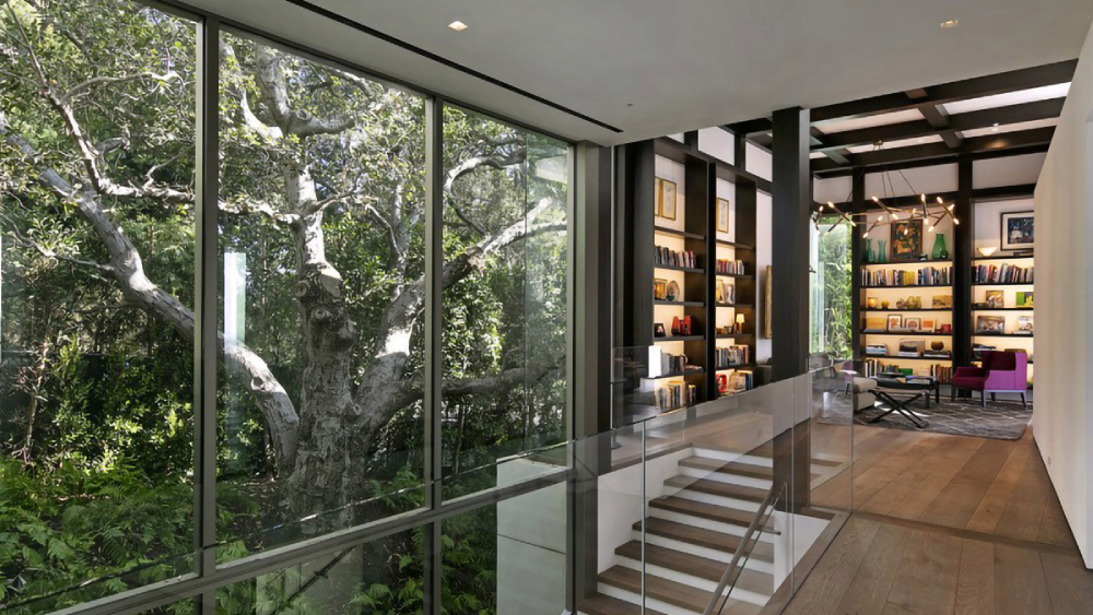 Verscholen achter een torenhoge muur van bamboe, werd het huis geïnspireerd door het Japanse ontwerp van ingetogen eenvoud en rustgevende esthetiek. Bijna elke kamer heeft monolithische glazen wanden van vloer tot plafond. Verder is er een de chique minimalistische keuken aanwezig met een prachtig uitzicht over de bergen van Santa Monica en – op een heldere dag – naar de Stille Oceaan.