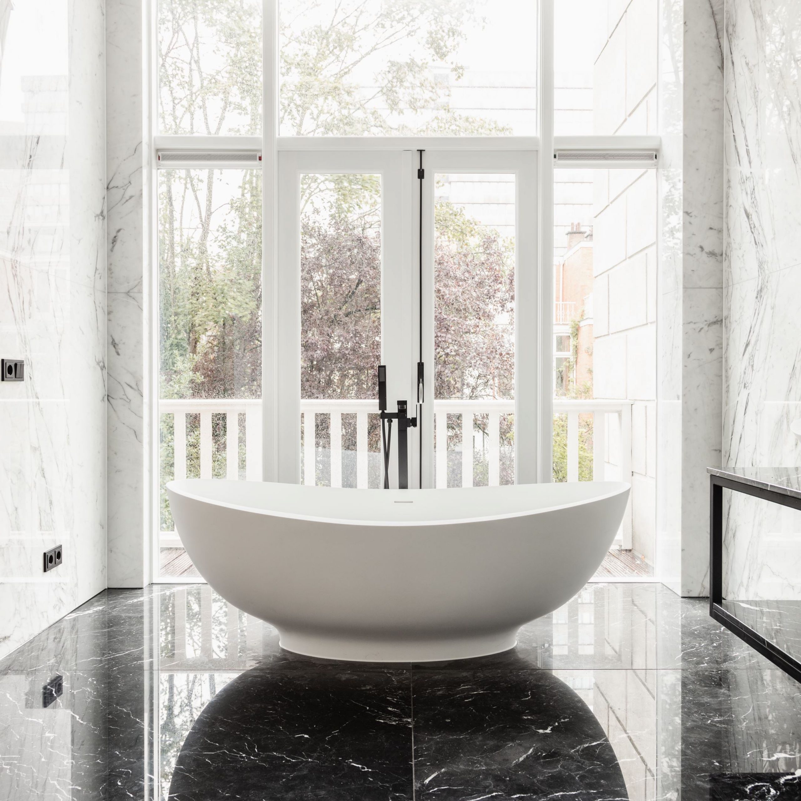 In het herenhuis, is er veel gebruik is gemaakt van marmer. Zo heb je in verschillende ruimtes, waaronder de badkamer, een marmeren vloer. Ook het kookeiland is grotendeels gemaakt van marmer. Ze hebben het natuursteen perfect weten te combineren met de rest van de inrichting. Zo past de zwarte keuken perfect bij het werkblad én worden er eigenlijk alleen maar zwarte en witte elementen gebruikt in de badkamer. In totaal is er 290 m² aan woonoppervlak. En perceel is nog goed voor zo’n 242 m².