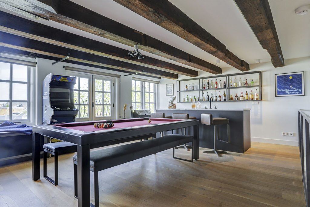Naast de woonkamer bevindt zich direct de keuken die voorzien is van alle moderne apparatuur – en een wijnkast. Aan de achterzijde van het appartement bevinden zich de 2 slaapkamers en 2 badkamers. De achterste slaapkamer heeft een balkon. Het is een behoorlijk speels optrekje. Dat is wel af te lezen aan de bar, pooltafel, sauna, arcadekast en slaapkamer met badkuip.
