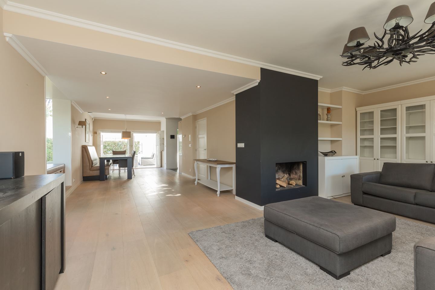 De woonkamer is voorzien van een open haard en openslaande deuren naar terras en tuin. Richting de eetkamer is een erker die evenals vanuit de keuken zich top de tuin biedt.
