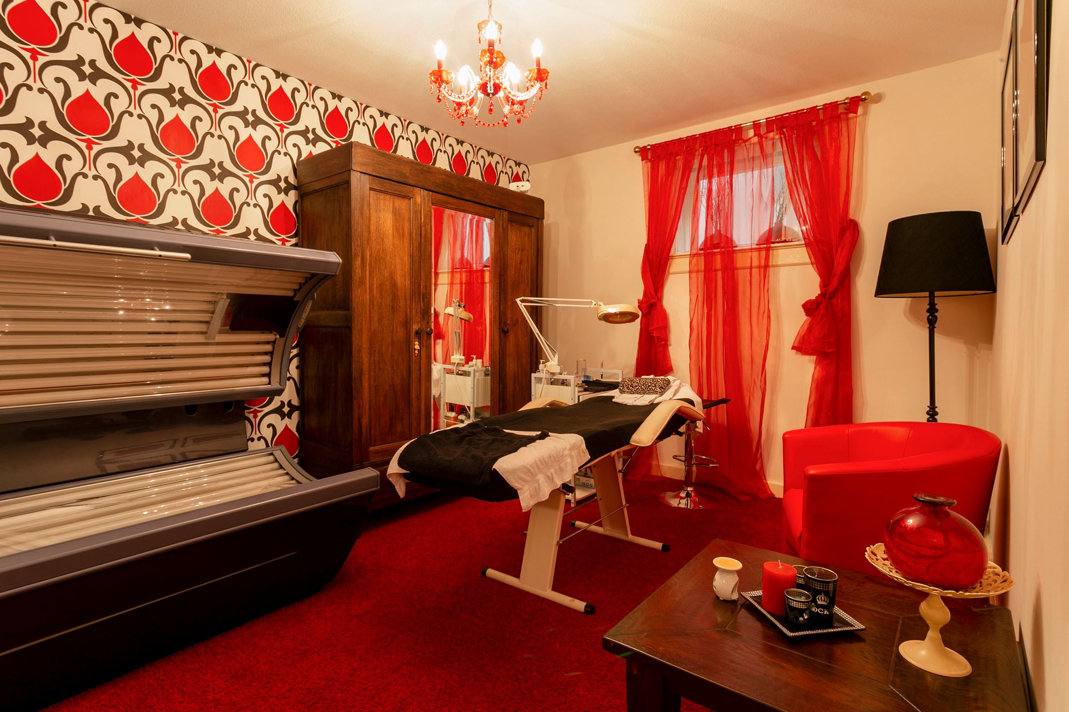Dan gaan we de hoogte in. Op de eerste verdieping zijn er 3 slaapkamers, kleedkamers en twee badkamers. De ietwat kitscherige master bedroom heeft openslaande deuren naar het balkon en bevat rode stijlelementen, evenals Romeinse pilaren.