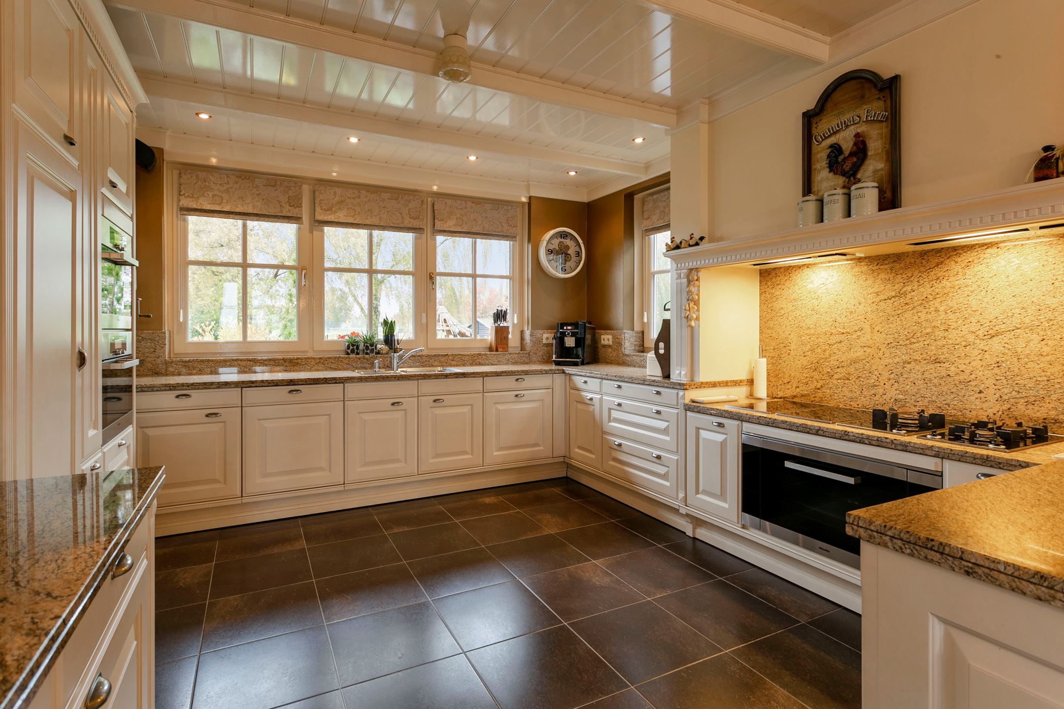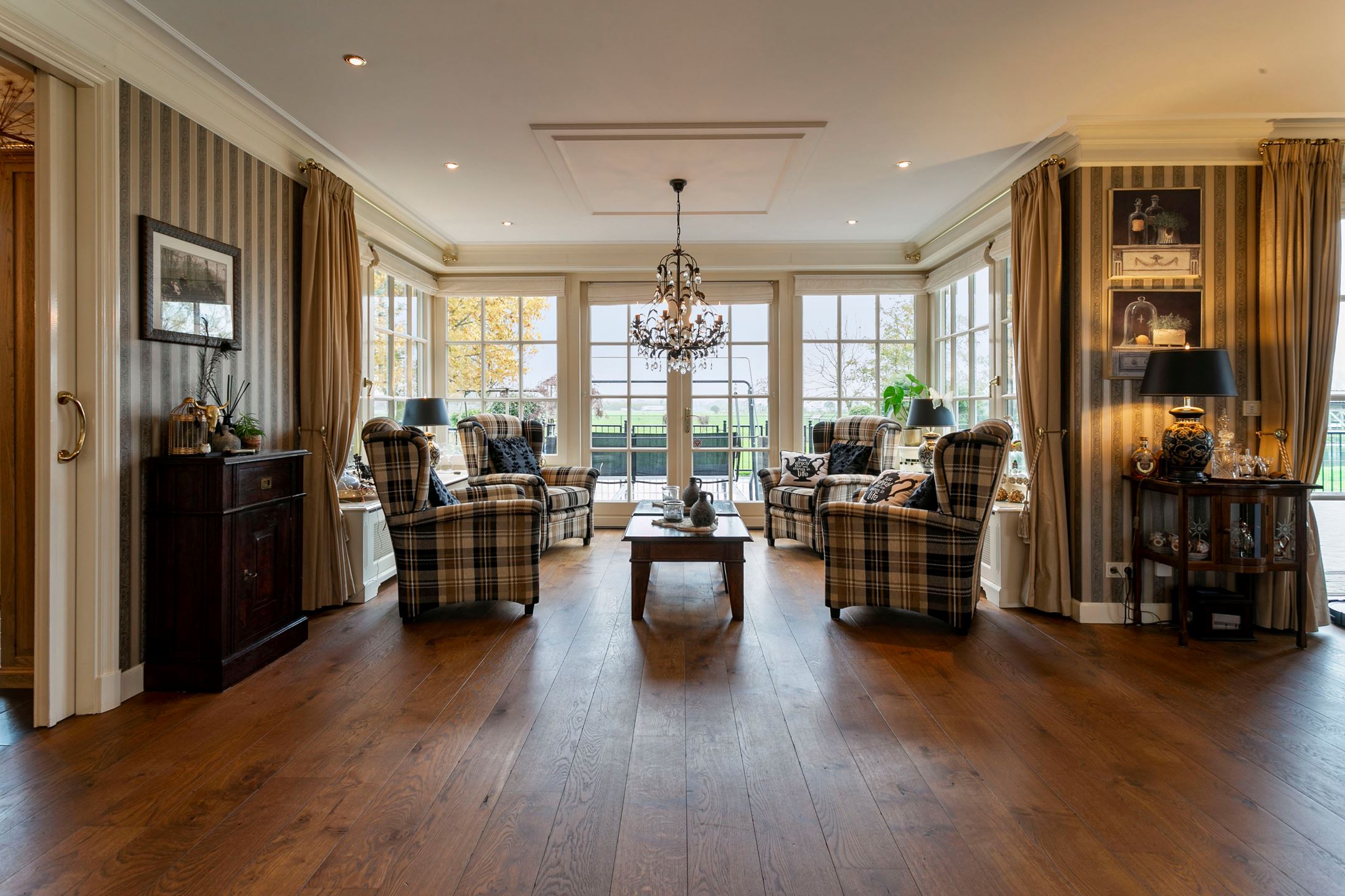 De voordeur biedt entree naar de ruime licht hal met fraaie trap en vide lift. Middels dubbele deuren is er toegang richting de de royale woonkamer met inbouwkasten, schouw met gashaard, Burberry-achtige stoelen en dubbel openslaande deuren naar het terras aan de achterzijde. Daarnaast nog een ruime woonkeuken, bijkeuken met achteringang en keukenblok.
