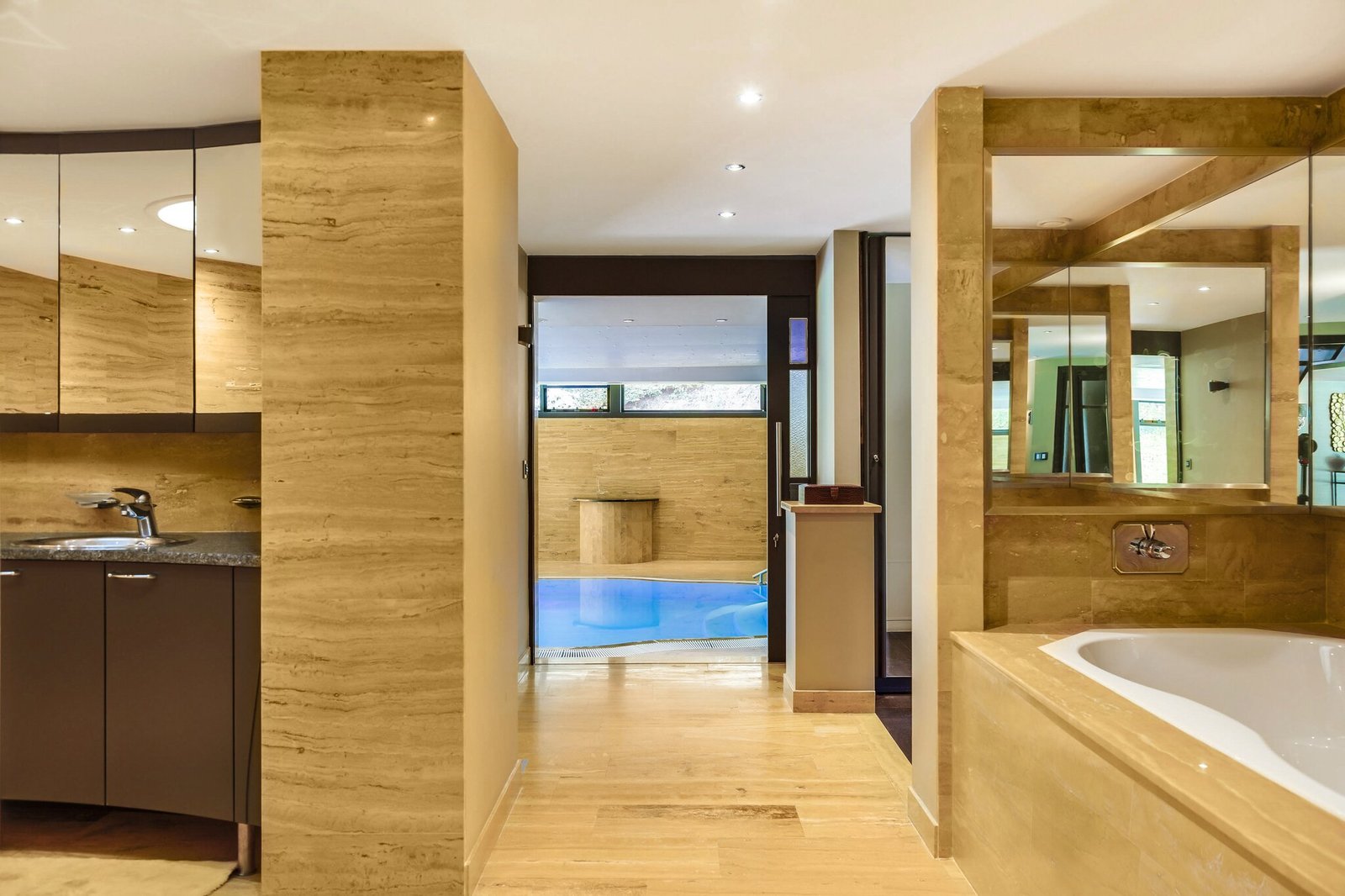 Er is een grote schuifdeur naar de tuin en via de andere zijde heeft u directe toegang tot de master bedroom. Hier is ook een stoomdouche, bubbelbad en een walk-in closet en te vinden. Vanuit de hal je terecht bij de overige drie slaapkamers.