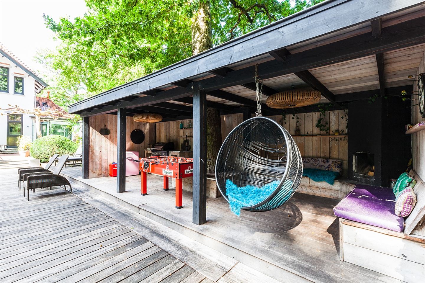 De tuin bevat een mooi lang zwembad met een mooi houten vlonder eromheen. Naast het zwembad is er nog meer dan genoeg ruimte voor een voor de kids, om die voor geruime tijd zoet te houden. De schuur naast het zwembad is een waar gezelschapshonk. Er is een hangstoel, tafelvoetbal, dartbord. Op latere leeftijd kunnen ze hier ook een heerlijk zwembadfeest geven, met wellicht een tap in de schuur.