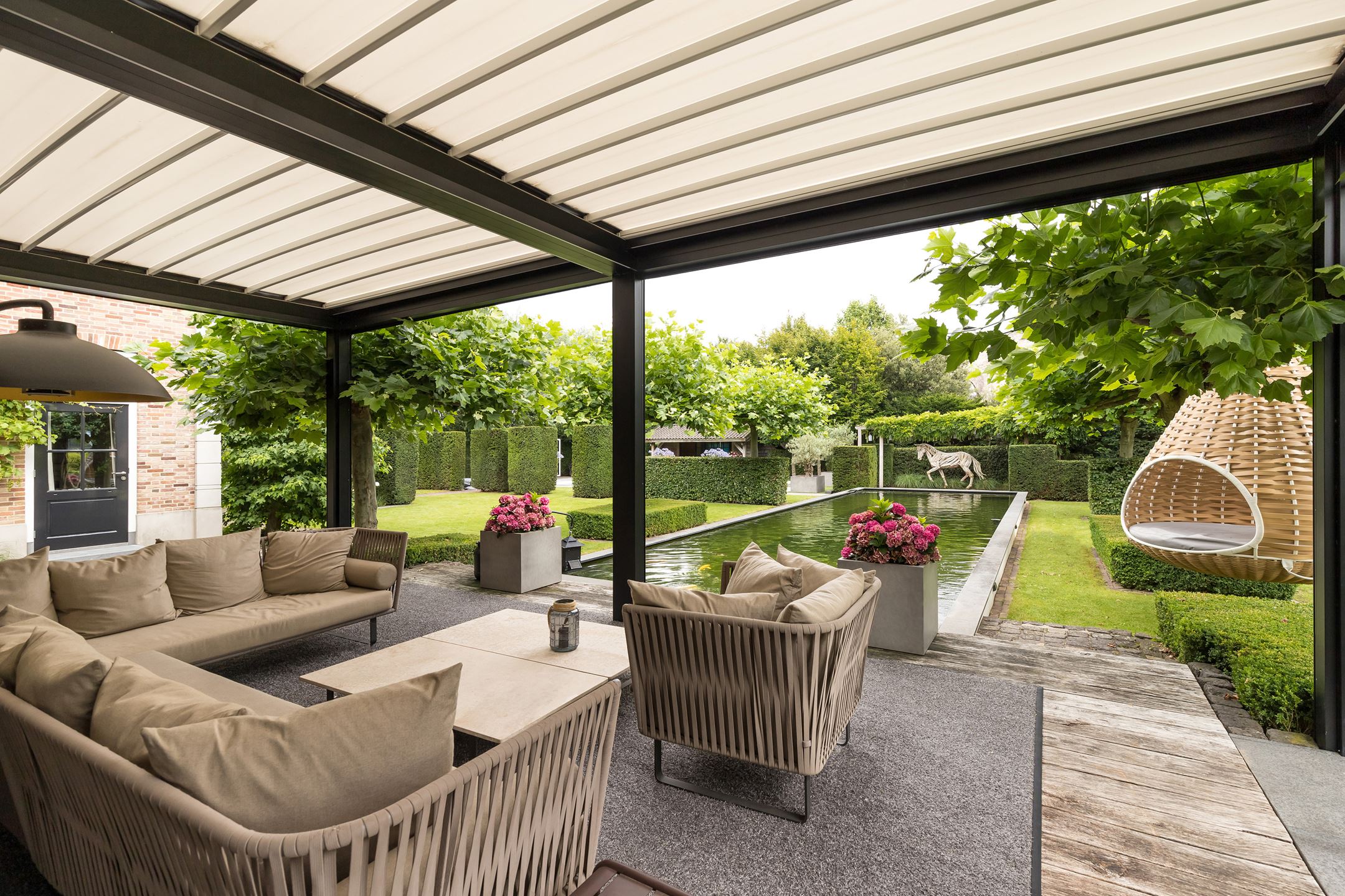 Onder de ‘opkamer’ bevindt zich een ruime kelder met veel natuurlijk licht, die op verschillende manieren geïnterpreteerd kunnen worden. De makelaar noemt alvast een aantal opties: “fitness ruimte echter met weinig moeite kan hier een biljartkamer, gezellige bar, wijnkelder of zelfs je eigen welness-ruimte worden gecreëerd”. We mogen ook de tuin met visvijver, poolhouse en het langwerpige zwembad niet vergeten.