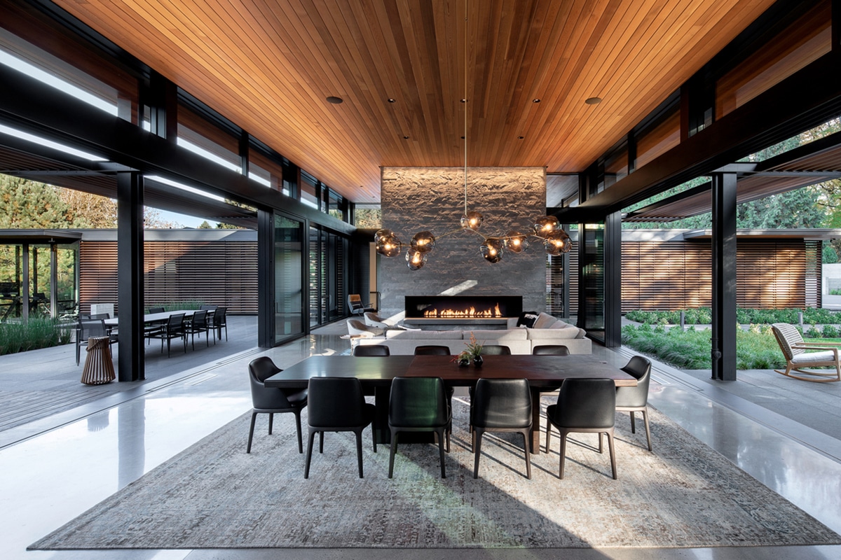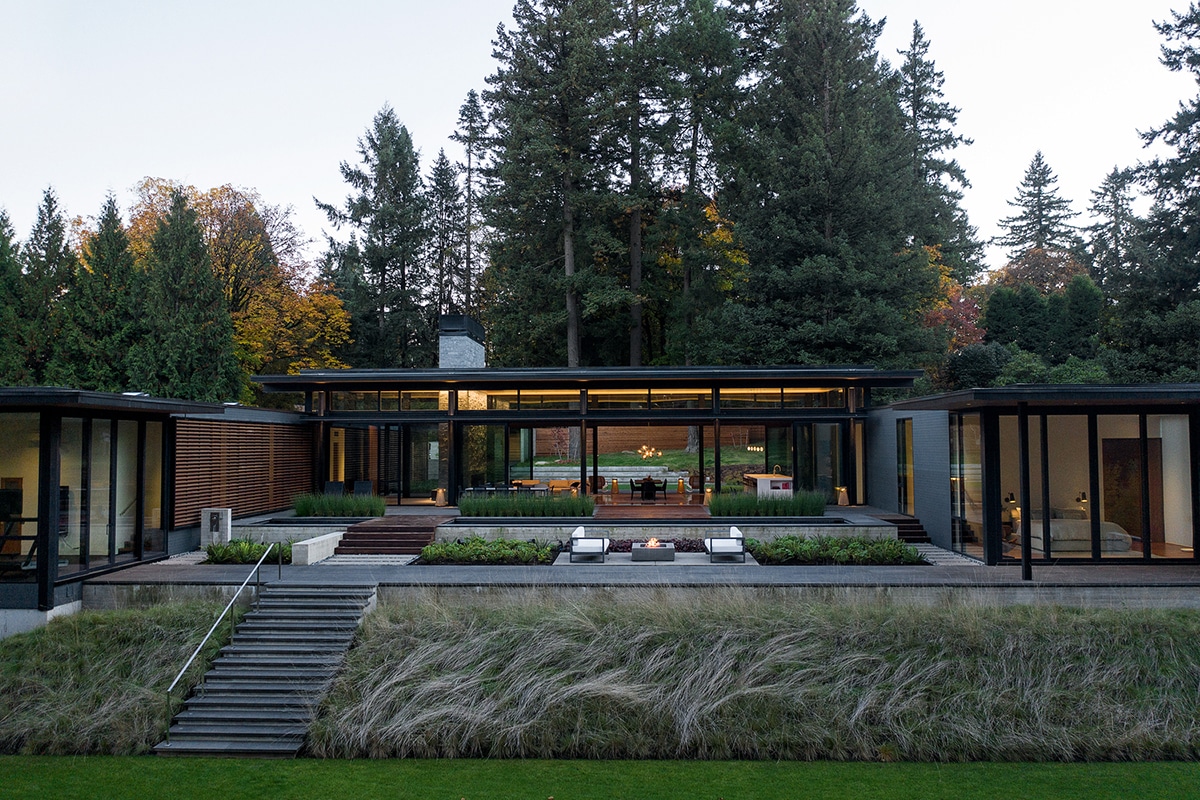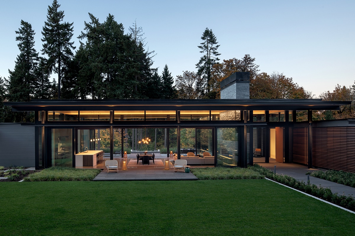 Dit bekroonde huis is gebouwd net buiten Portland, Oregon en trekt als eerste de aandacht met een grote en ruime grote kamer, bestaande uit de keuken en living. Het open gebied biedt een fantastisch uitzicht en creëert een open, luchtig gevoel. Voornamelijk te danken aan de kamerhoge glazen deuren.