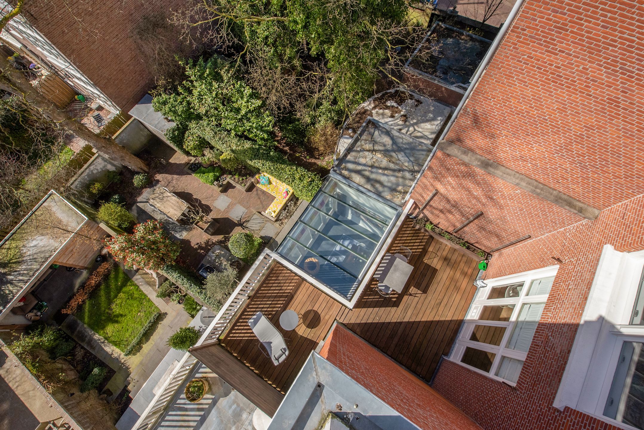 De achtertuin is onder architectuur aangelegd en wordt gecompliceerd door ‘n mooie esdoorn. Die genereert een fijne schaduw tijdens de warme zomerdagen. Voor de kopers die de voorkeur hebben om in de volle zon te zitten heeft de eigenaar een reeds verleende kapvergunning.