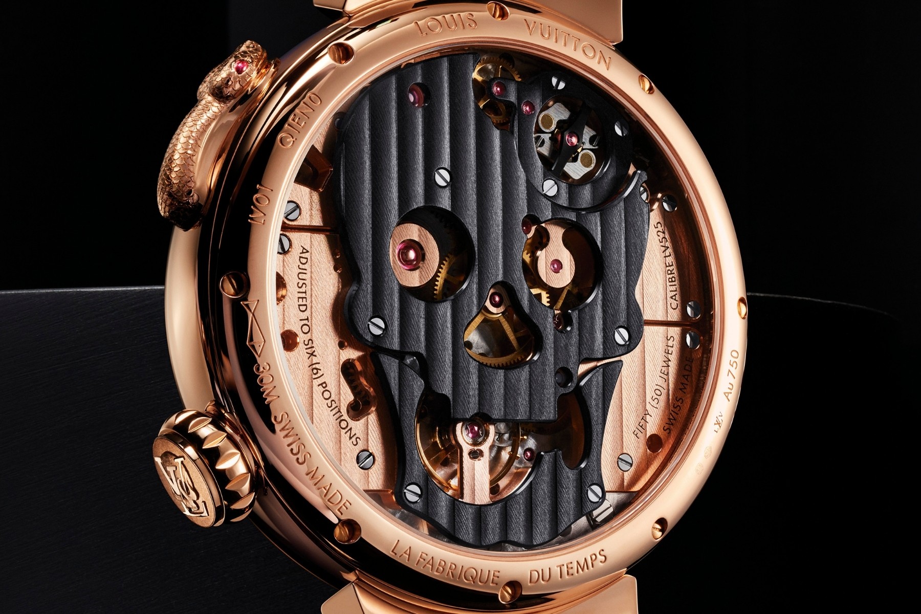 Louis Vuitton organiseerde vorige maand een onthulling van de nieuwste horloges van het modehuis in de Place Vendôme-salons. Het was een preview voorafgaand aan de Watches & Wonders 2021 luxebeurs, die vanaf vandaag live-streamt vanuit Genève. Meest opmerkelijk van hn doodskop-uurwerk: het horloge bevat een drukknop die de wijzerplaat stimuleert met een slang en een schedel die de tijd aangeeft.