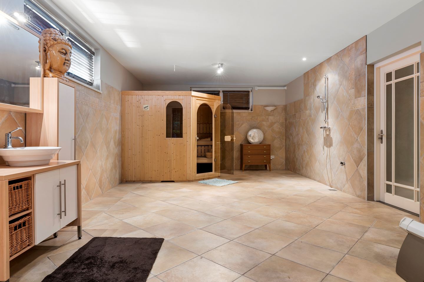 Het souterrain beschikt over een volwaardige fitnessruimte, betegelde ontspanningsruimte met sauna, douche, werkkamer en slaapkamer. Vanuit de sauna en het kantoor is er middels openslaande deuren toegang tot de tuin.