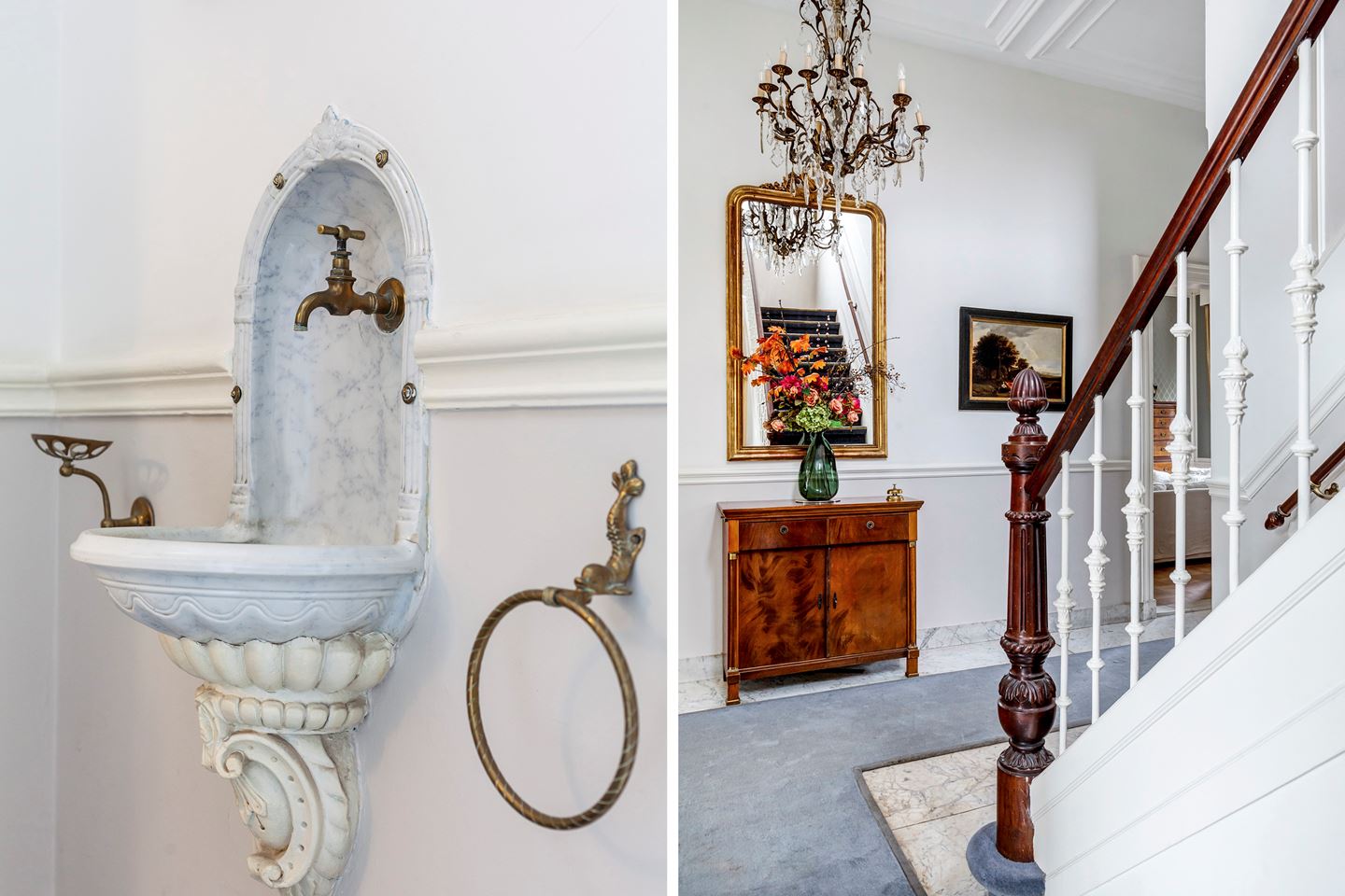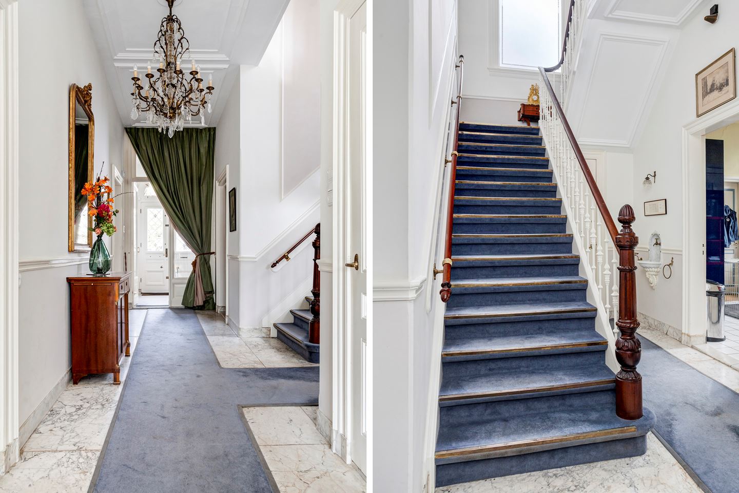 De eerste verdieping is te bereiken via breed, klassiek open trappenhuis met veel lichtinval. Aan de voorzijde is een antichambre, afgesloten met deur, waaraan klein bordes. Aan de achterzijde kan je via de gang terechtkomen bij de dubbele deuren die een balkon achter zich hebben verscholen Hier tegenover is een grote en lichte slaapkamer, met nog een open haard, die weer toegang geeft tot een badkamer met ligbad, douche, toilet en dubbele wastafel in marmeren aanrecht.