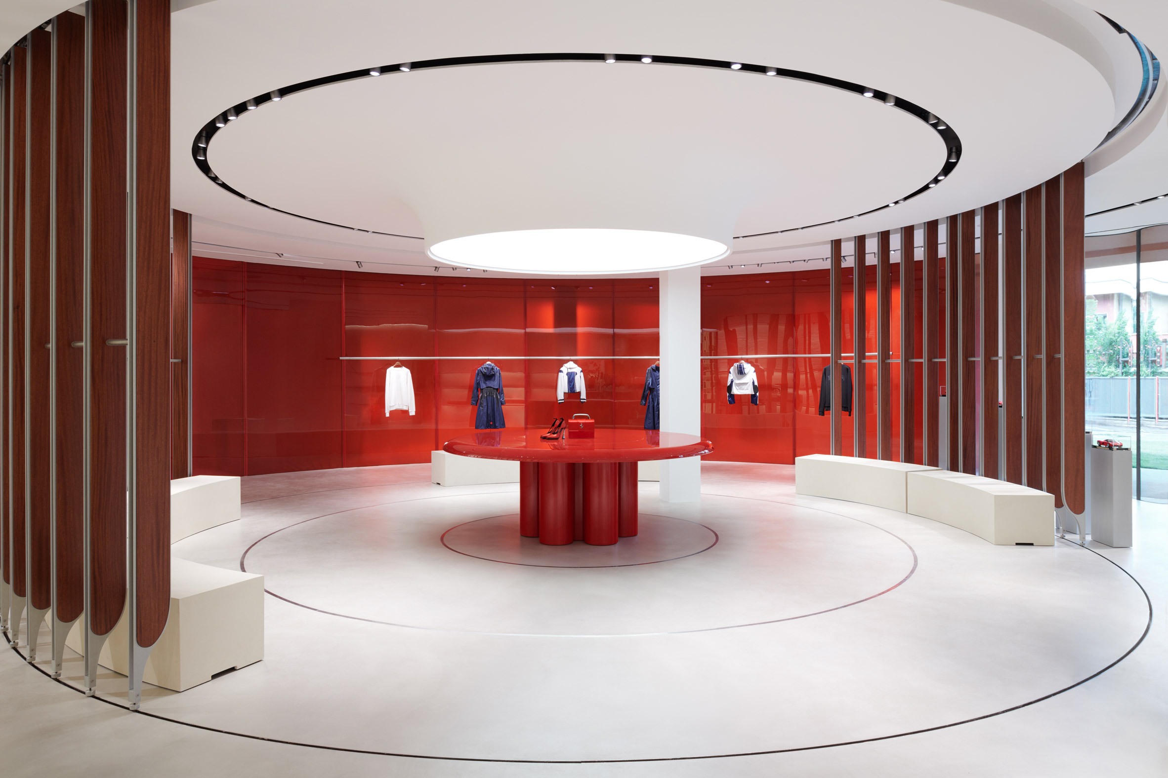 Aan de buitenkant heeft de winkel een terracotta façade met zuilengalerijen die verwijzen naar de traditionele kleur van de daken van Modenese huizen en de historische koepels in Italiaanse architectuur. Het interieur daarentegen heeft kronkelende vormen en glanzende rode en witte oppervlakken.