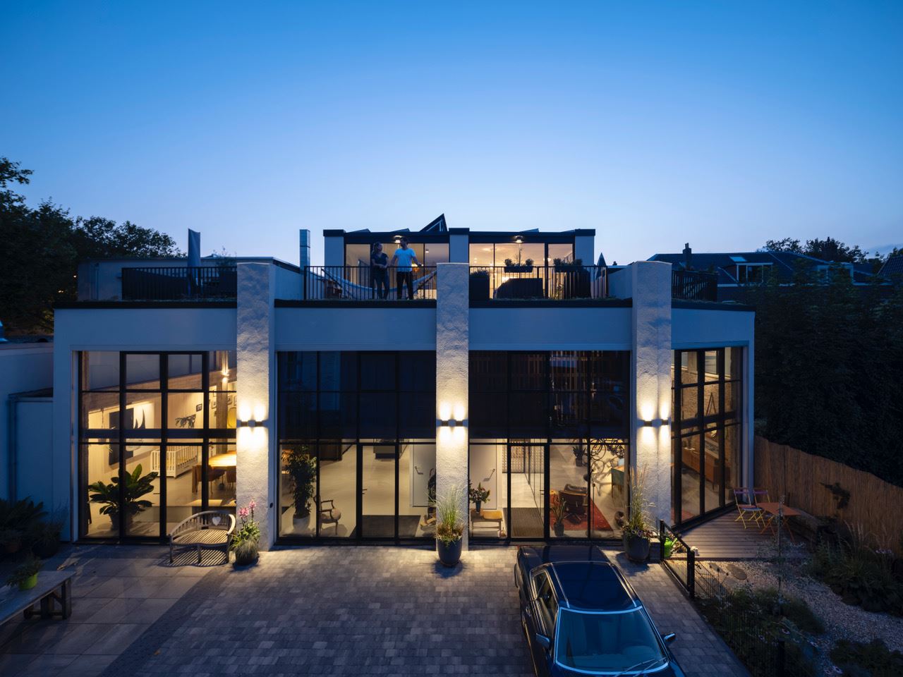 De stalen trap leidt naar de eerste verdieping met een slaapkamer gelegen aan de voorzijde. Het is eenvoudig om hier indien gewenst een derde slaapkamer op deze verdieping te realiseren. Vanaf de overloop is er een lichte trapopgang naar de tweede verdieping, deze verdieping bestaat voor het grootste deel uit glas. Een glazen loopbrug biedt doorgang naar het dakterras, die uitkijkt over de straat. Deze ruimte is multifunctioneel, er is een extra keuken gerealiseerd – ook al kan die volgens ons nog wel een stijl-upgrade gebruiken. Wel lekker om hapjes te bereiden voor een avondje op het dakterras.