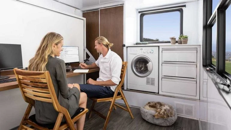 De luxe campers van Living Vehicle worden elders gekenmerkt door zijn kenmerkende aluminium omhulsel en op het dak gemonteerde zonnepanelen, die samenwerken met een lithiumbatterijsysteem. De Pro-EV-versie in de 2022-reeks wordt geleverd met een verbeterd elektrisch systeem, waardoor het de krachtigste off-the-grid-trailer ter wereld is.