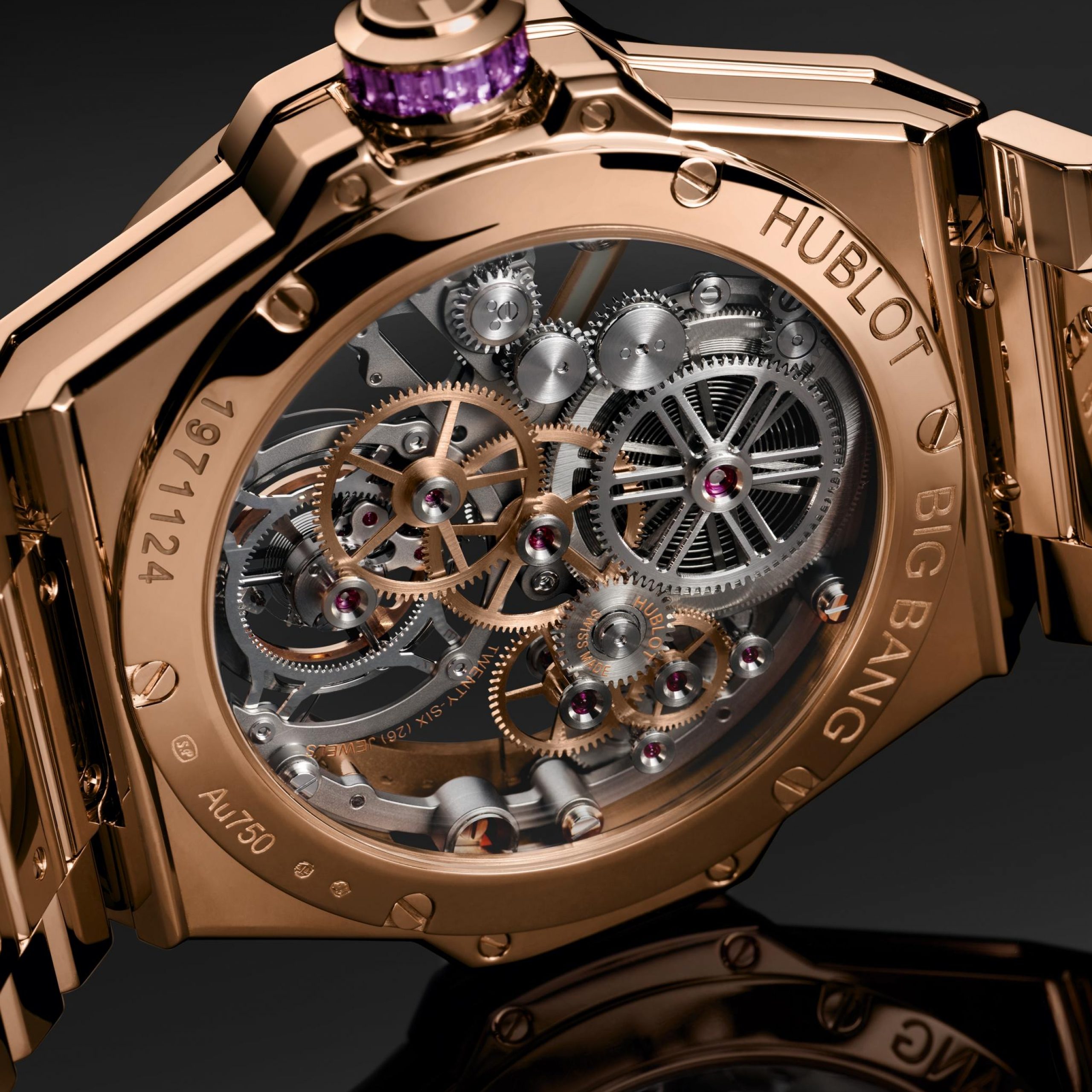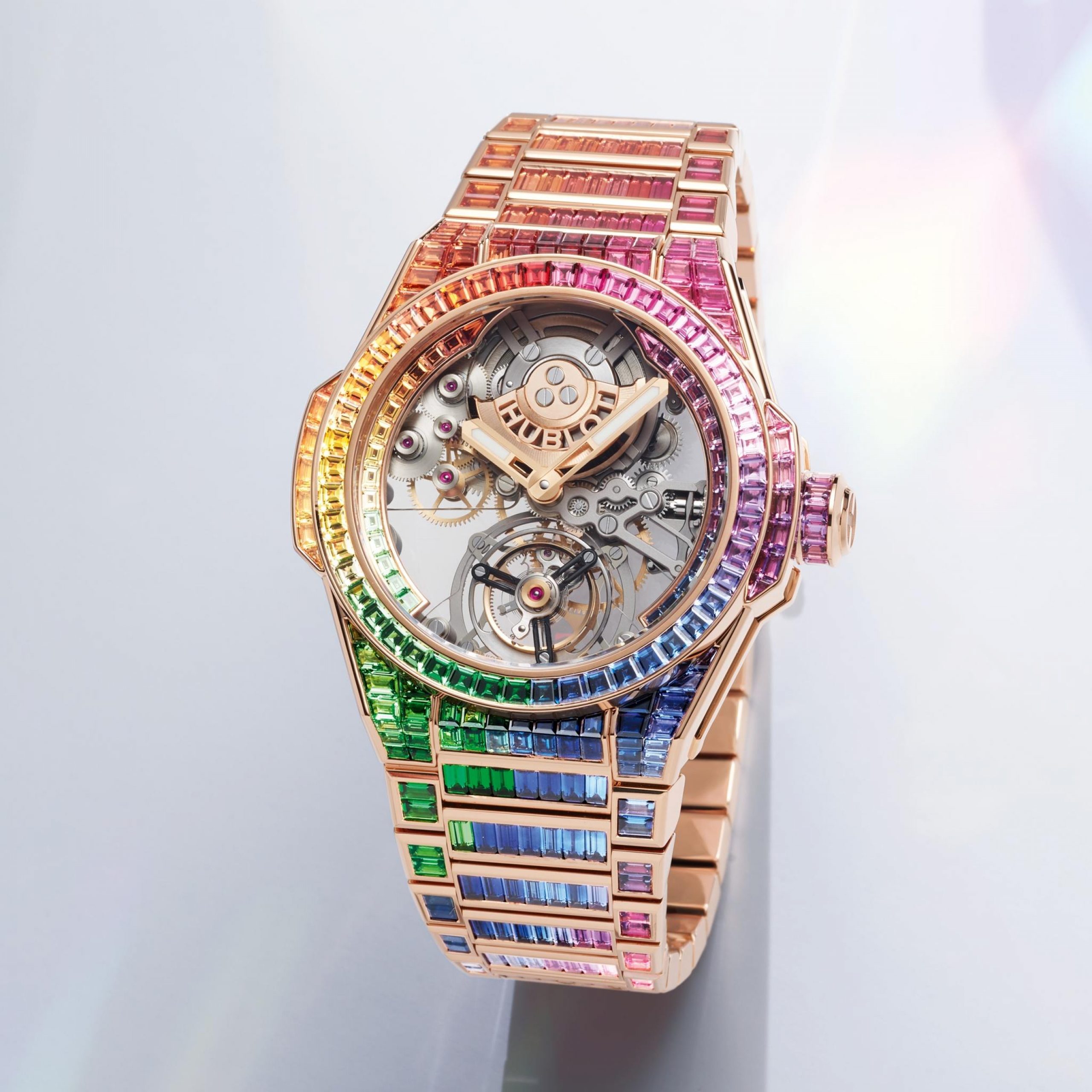 De twee nieuwe Big Bang Tourbillon-modellen zijn verkrijgbaar in King Gold (roségoud) of witgoud – elk bezet met 36 karaats veelkleurige edelstenen. Hublot zegt dat 1200 uur werk gaat in het selecteren, snijden en plaatsen van de stenen voor ieder individueel exemplaar.