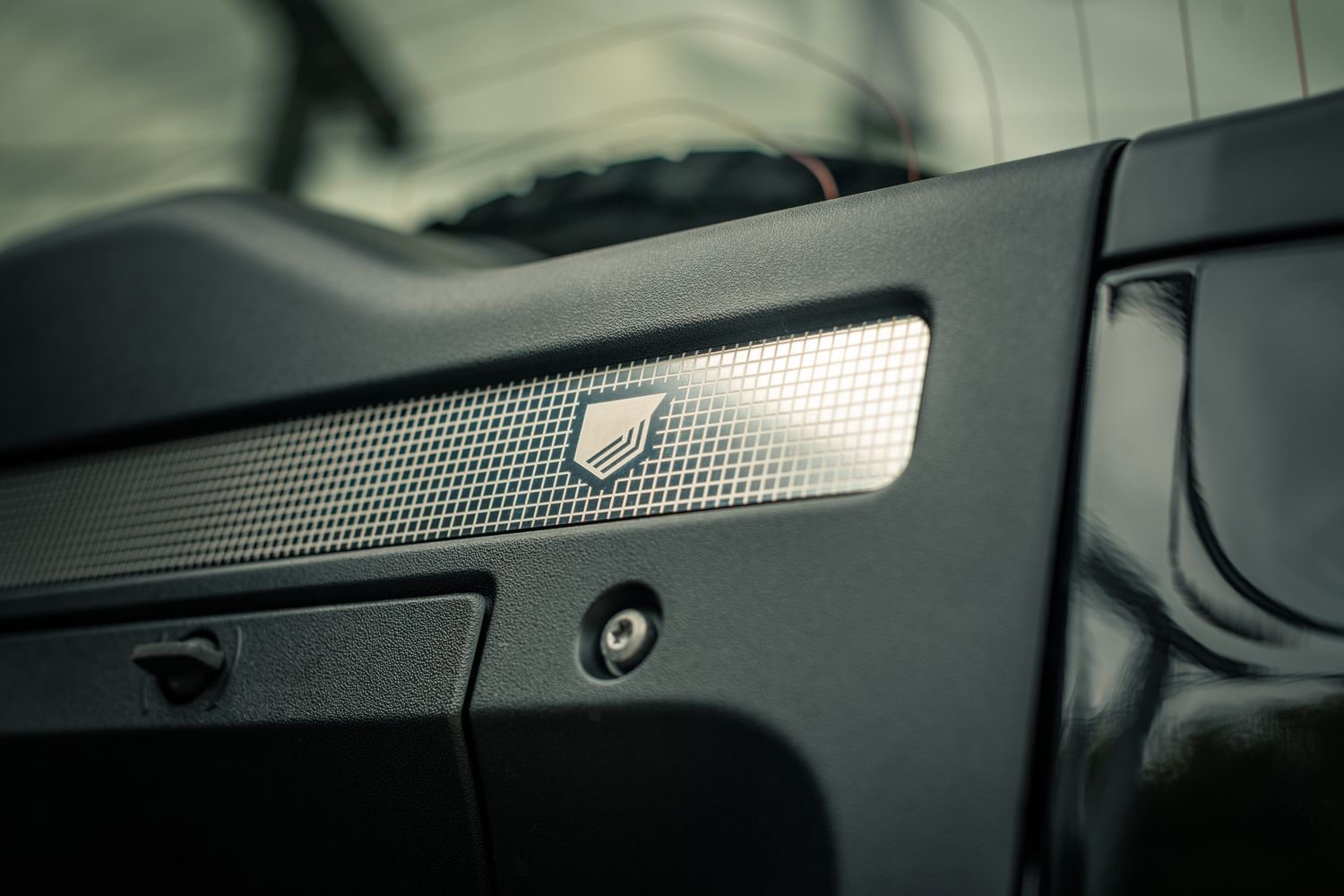 Heritage Customs hebben de Valiance op verzoek van Gerschtanowitz het dashboard, de deurgrepen, de onderste luidsprekerkappen en een selectie van andere elementen in Santorini Black gespoten. “Zwart leer en Alcantara werden toegepast om de stoelen, deurpanelen, bovenste luidsprekerkappen en dashboard te bekleden, met een contrasterend stiksel in gebroken wit afgewerkt,” vertelt Niels van Roij, auto-ontwerper en mede-eigenaar van Heritage Customs. “Op de hoofdsteunen is een lasergegraveerd, in plaats van geborduurd, Heritage Customs-logo te vinden. Het zorgt voor bijzondere tactiele eigenschappen en een ingetogen en unieke esthetiek. De geëtste decoratieve plaat in de achterklep heeft een diep 3D-effect van kleine vierkantjes.”