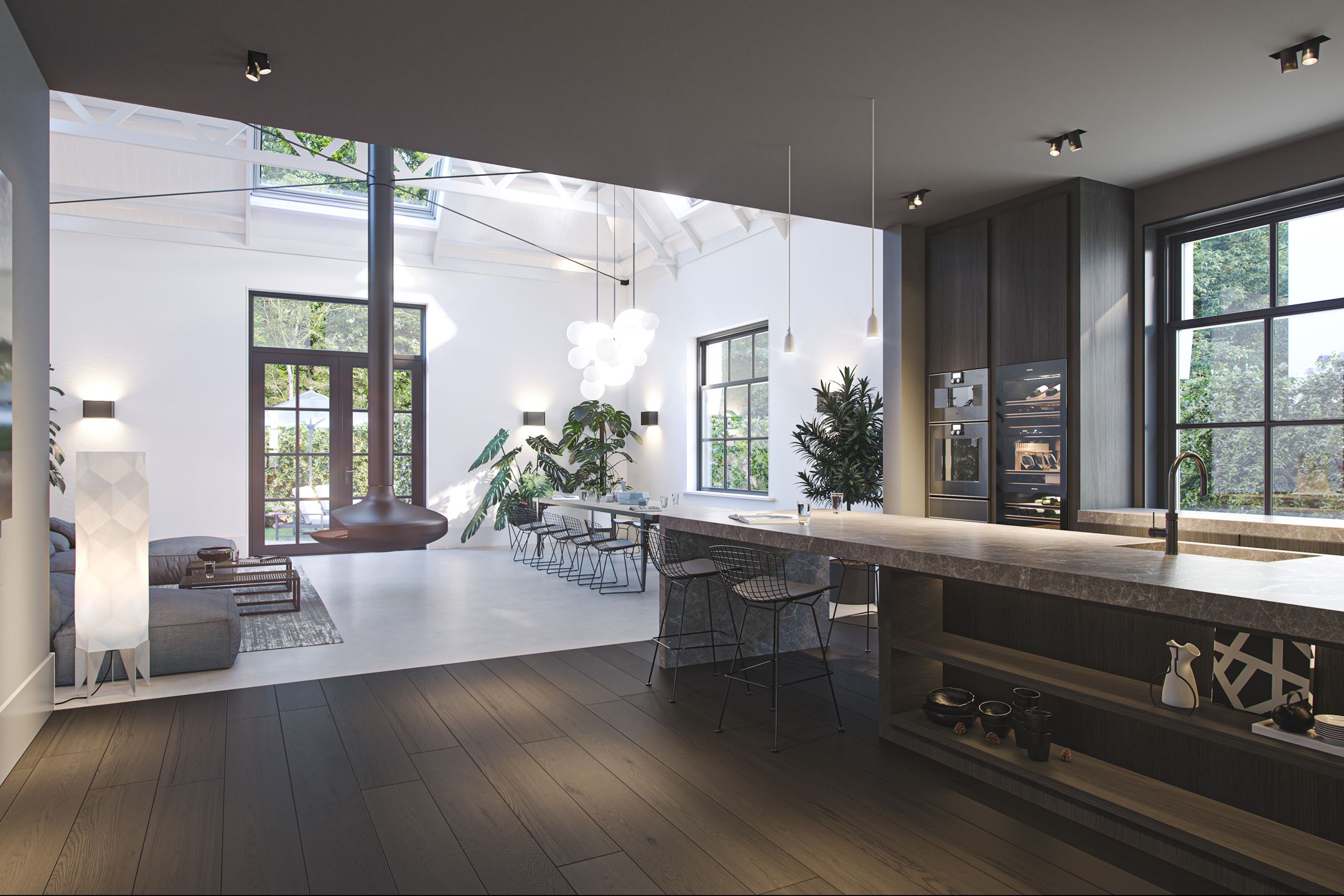 De toekomstige woning heeft een doordacht en modern ontwerp. Vooral de woonkeuken is daar een goed voorbeeld van. Het woongedeelte is haast geheel wit, met stalen accenten door onder meer de deuren, raamkozijnen, stoelen en niet te vergeten de open haard die van het plafond hangt. De keuken is daarentegen donkerder, met veel hout en marmeren bladen. Het geeft een soort Yin en yang-effect: alles lijkt in balans met elkaar te zijn.