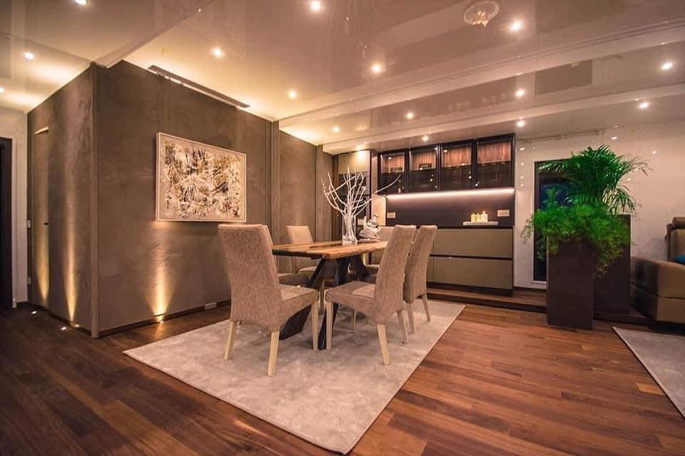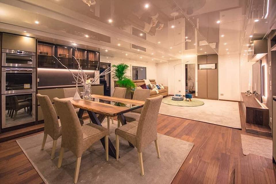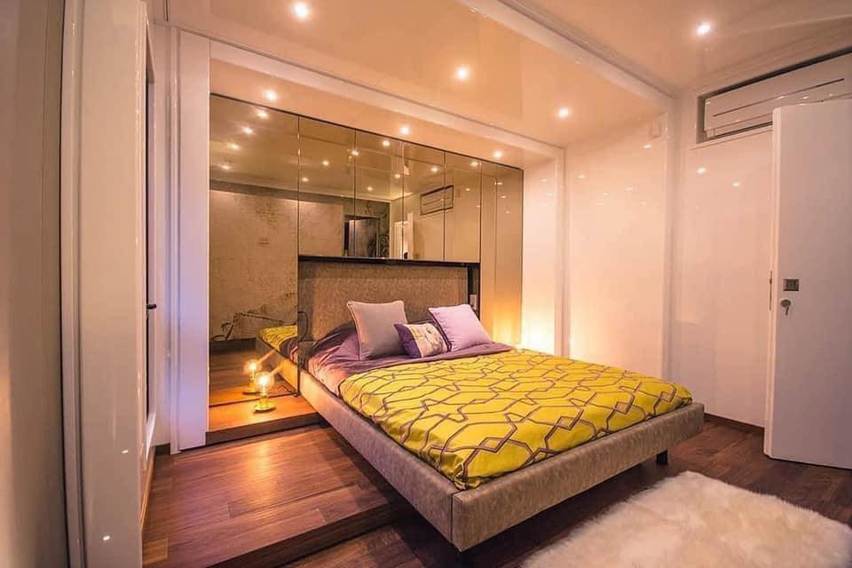 Het heeft alles waar een volwaardige gezinswoning ook over beschikt – en misschien nog wel beter. Er is een ruime living met bank, waar je uren kunt spenderen voor de grote flatscreen in de muur. In deze zelf open ruimte ligt ook de keuken met hoogglans afwerkingen en allerlei inbouwmateriaal.