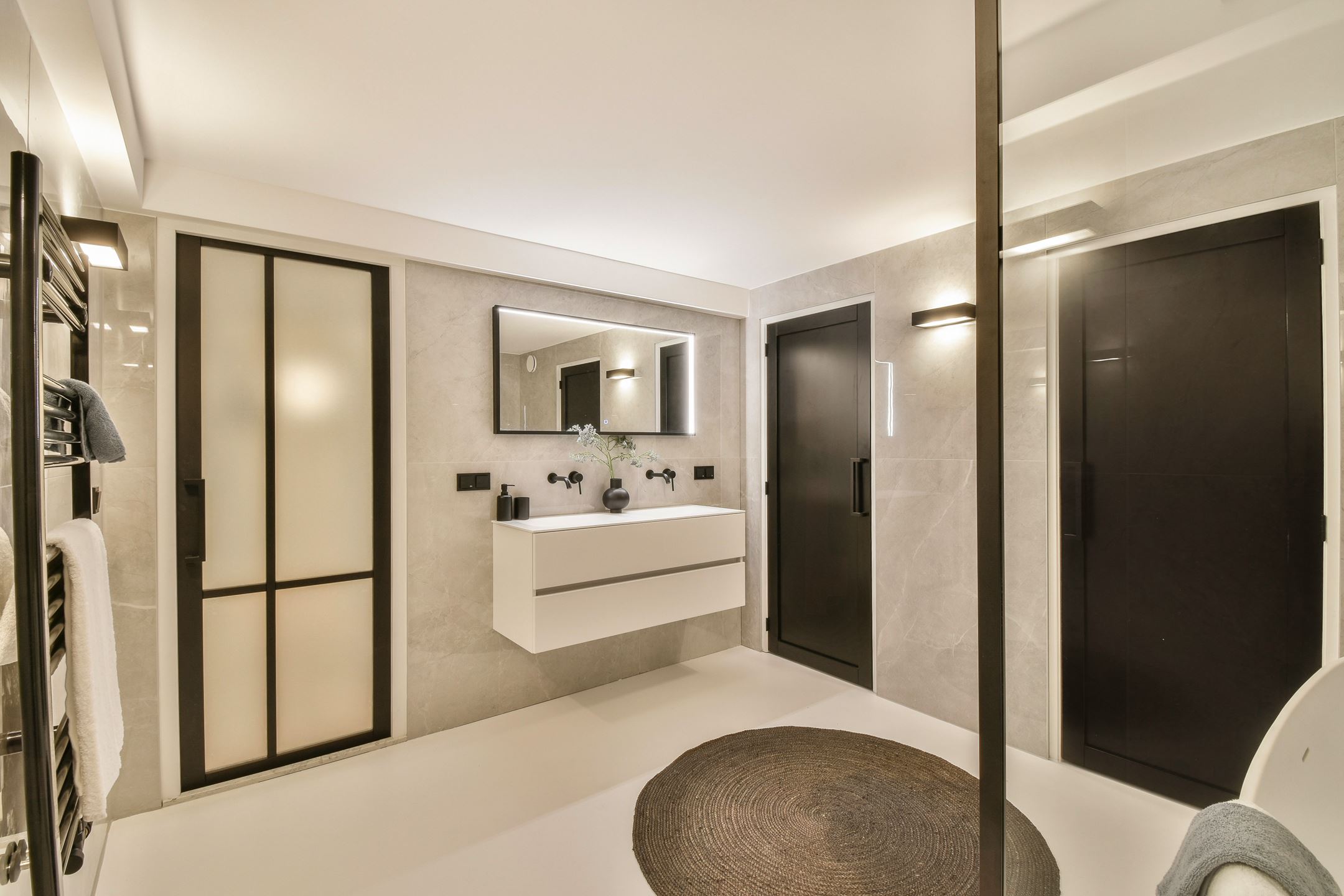 Drie van de vier slaapkamers zijn gelegen op de souterrain, terwijl de het resterende vertrek zich op de begane grond bevindt. Opfrissen is zo gepiept in de ‘master bathroom’, die een regendouche met glazen wanden en een prachtig wastafelmeubel bevat.