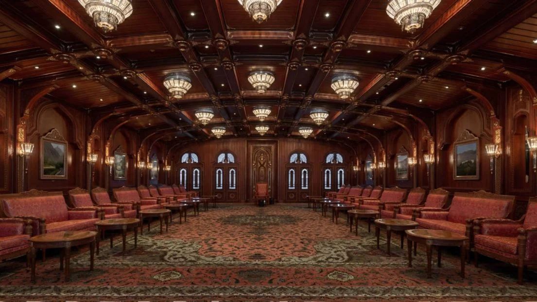 Het jacht is uitgerust met medische kamers, een tandheelkundige kamer, talrijke vergaderruimten, lounges en amusementsvoorzieningen, waaronder een privé-bioscoop met maar liefst 50 zitplaatsen. Het interieur is voorzien van talloze Omaanse details door het hele decor,.