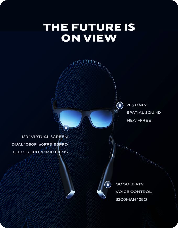 Het bevat zowel de centrale verwerkingseenheid als de grafische verwerkingseenheid, samen met een intuïtief bedieningspaneel. Wie het frame opzet krijgt visueel toegang tot een 120-inch ‘pixelvrij’ virtueel scherm die in vrijwel elke lichtomstandigheid gebruikt kan worden.