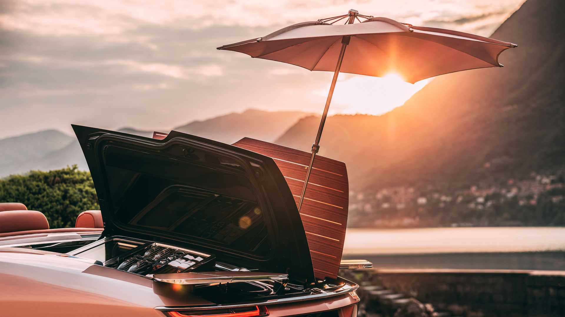 Het interieur is ook een lust voor het oog met cognac- en oesterkleurig leer, afgewerkt met notenhouten. In het dashboard is een fraai uurwerk verwerkt, een uit de eigen collectie van de klant en net als in de eerst editie is het servies, een champagnekoeler en de parasol en klapstoeltjes weer van de partij voor een uitermate decadente picknick.