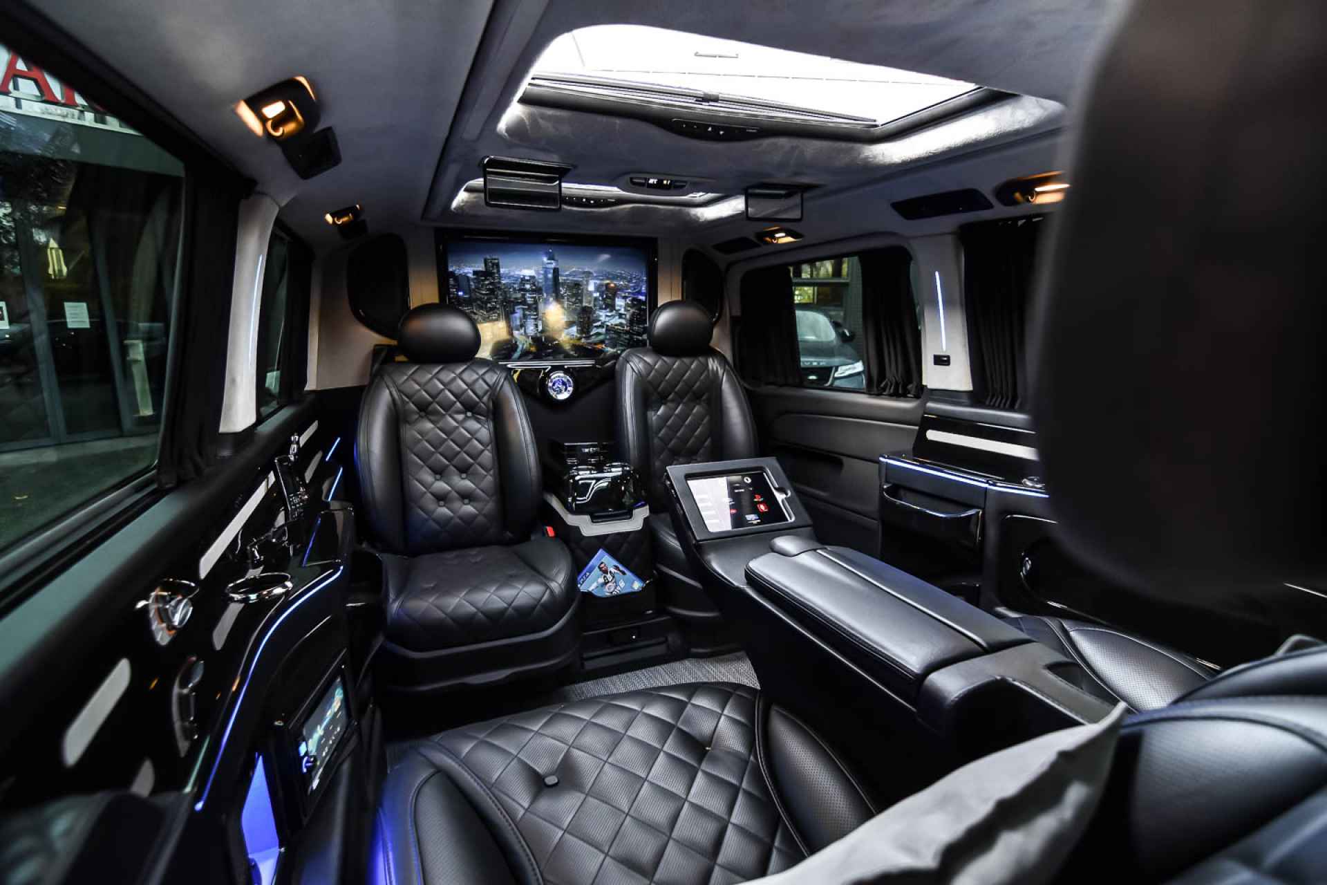 Deze V-klasse is onder andere uitgerust met champagneglazen, lederen stoelen en een uitklapbaar tv-scherm