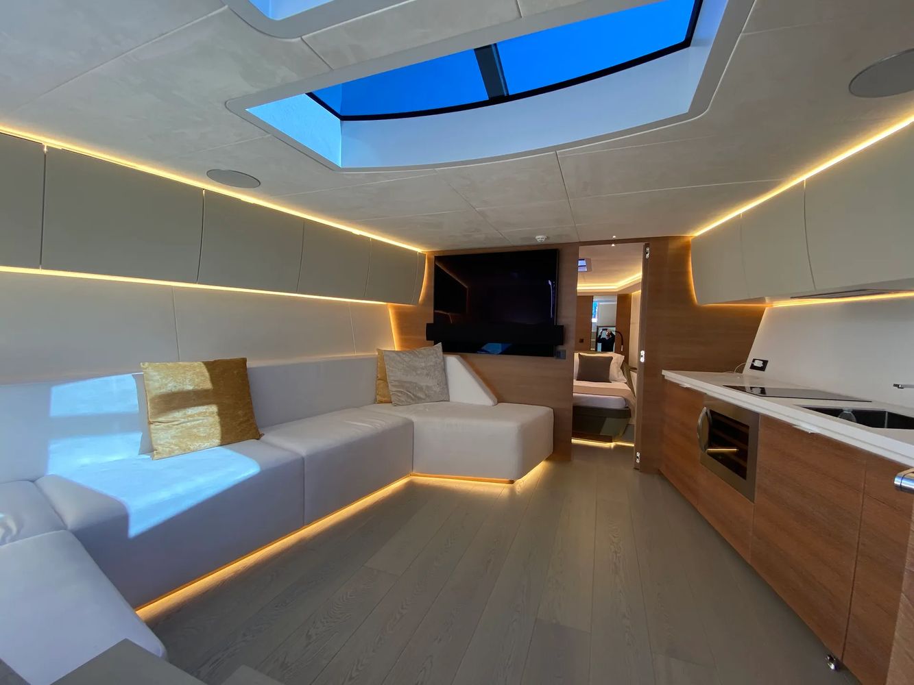 Zo goed als ieder kenmerk van zowel het interieur is gestroomlijnd en strak afgewerkt, terwijl de badkamermeubels, het bed, de keukenkasten en de bank worden verlicht door spotjes en lichtstrips. Na een dag op het water kan uw al het resterende zout van uw afspoelen in de douche, want ja, die is ook van de partij.