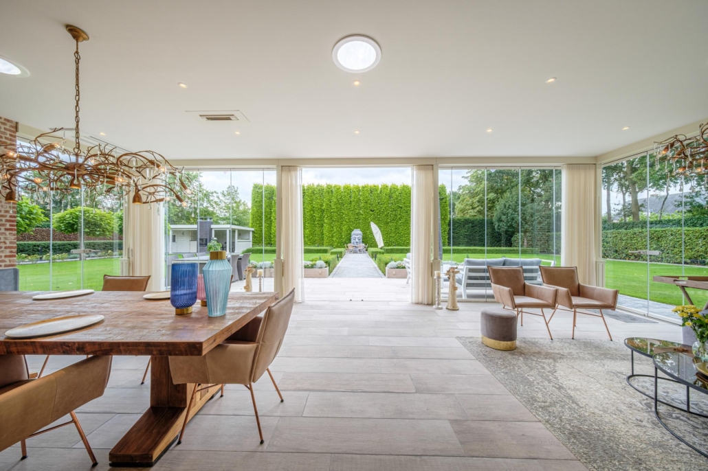 De tuin is stijlvol en in symmetrie aangelegd en bovendien ideaal georiënteerd op het zuidoosten. De tuin is volledig omheind en afgesloten met automatische toegangspoort. Achteraan in de tuin vindt u een tuinberging en daarnaast een overdekt terras met buitenkeuken, heaters en open haard en BBQ.