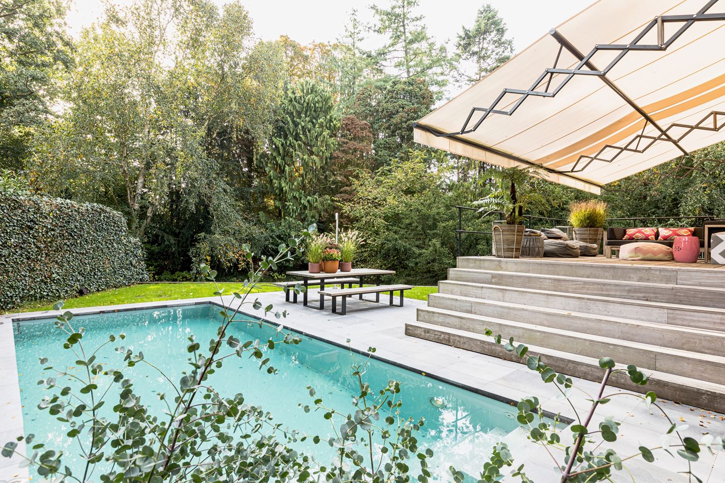 Als we alle trappen afstruinen belanden we op het gegeven moment in het souterrain, waar de speel/tv-kamer is. Aansluitend aan deze ruimte bevindt zich de fitness-ruimte met douche en aangrenzende sauna. De nabijgelegen bijkeuken biedt directe toegang naar de achtertuin. In deze tuin wordt het zwembad vergezeld door een poolhouse met houten details en voorzien van gashaard en zonnescherm.