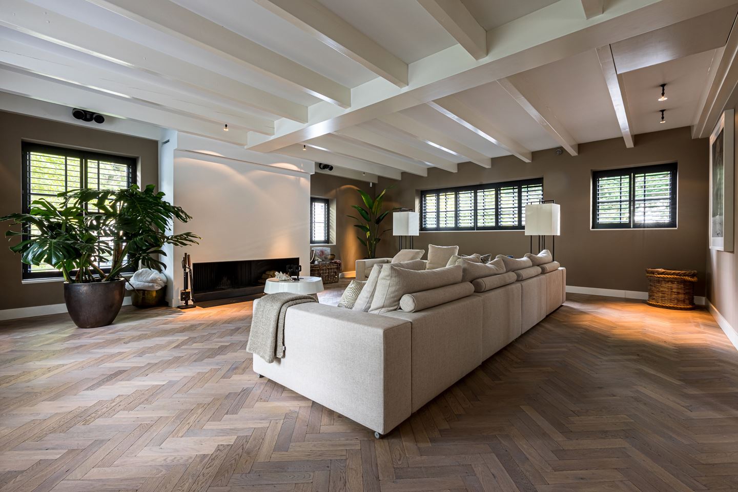 In de woonkamer aan de voorzijde is een houten visgraatvloer aangelegd en is voorzien van een open haard en bioscoopfunctie. De open keuken met houten balken is gelegen aan de achterzijde van het huis met verschillende open deuren naar zowel het verhoogde terras en toegang naar de tuin.