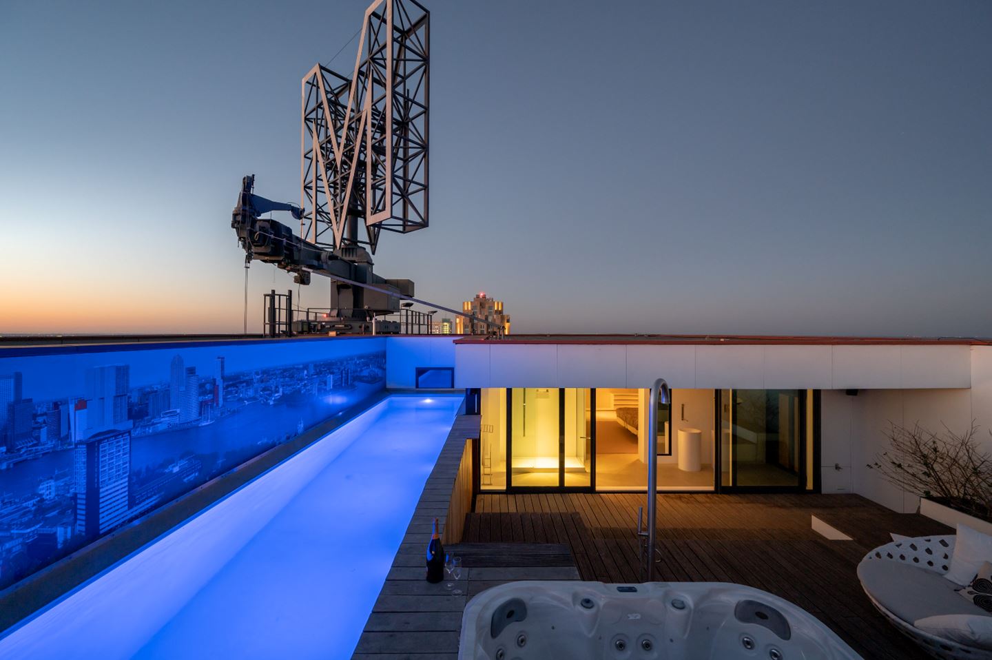 Het is op ieder vlak een indrukwekkend appartement, maar wat ongetwijfeld het meest vermeldenswaardig is, is dat het privé-zwembad (11m lang, 2m breed, 1,50m diep) op het dak volgens de makelaar het hoogste privé-zwembad van Nederland is. “Royaal penthouse met het hoogst gelegen privé zwembad van Nederland, een jacuzzi en twee grote buitenterrassen op een absolute toplocatie met panoramisch uitzicht over heel Rotterdam en de Maas”, schrijft de makelaar van dienst.