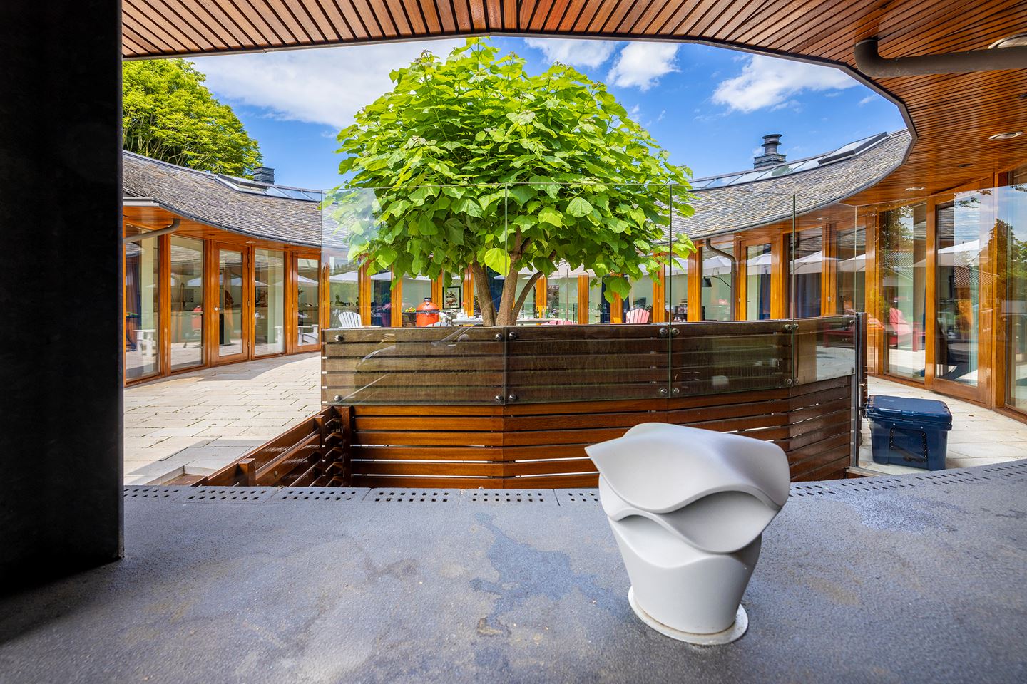 De moderne interieur is spelonkachtig met open verdiepingen en hoge plafonds. De vloer is visgraat gelegd en alle muren zijn strak wit gestuct. De badkamers zijn beiden kleurrijk vormgegeven met kleine tegeltjes, terwijl gasten in de woonkamer warm gehouden worden door een opmerkelijke open hard die uit het plafond afdaalt naar de grond.
