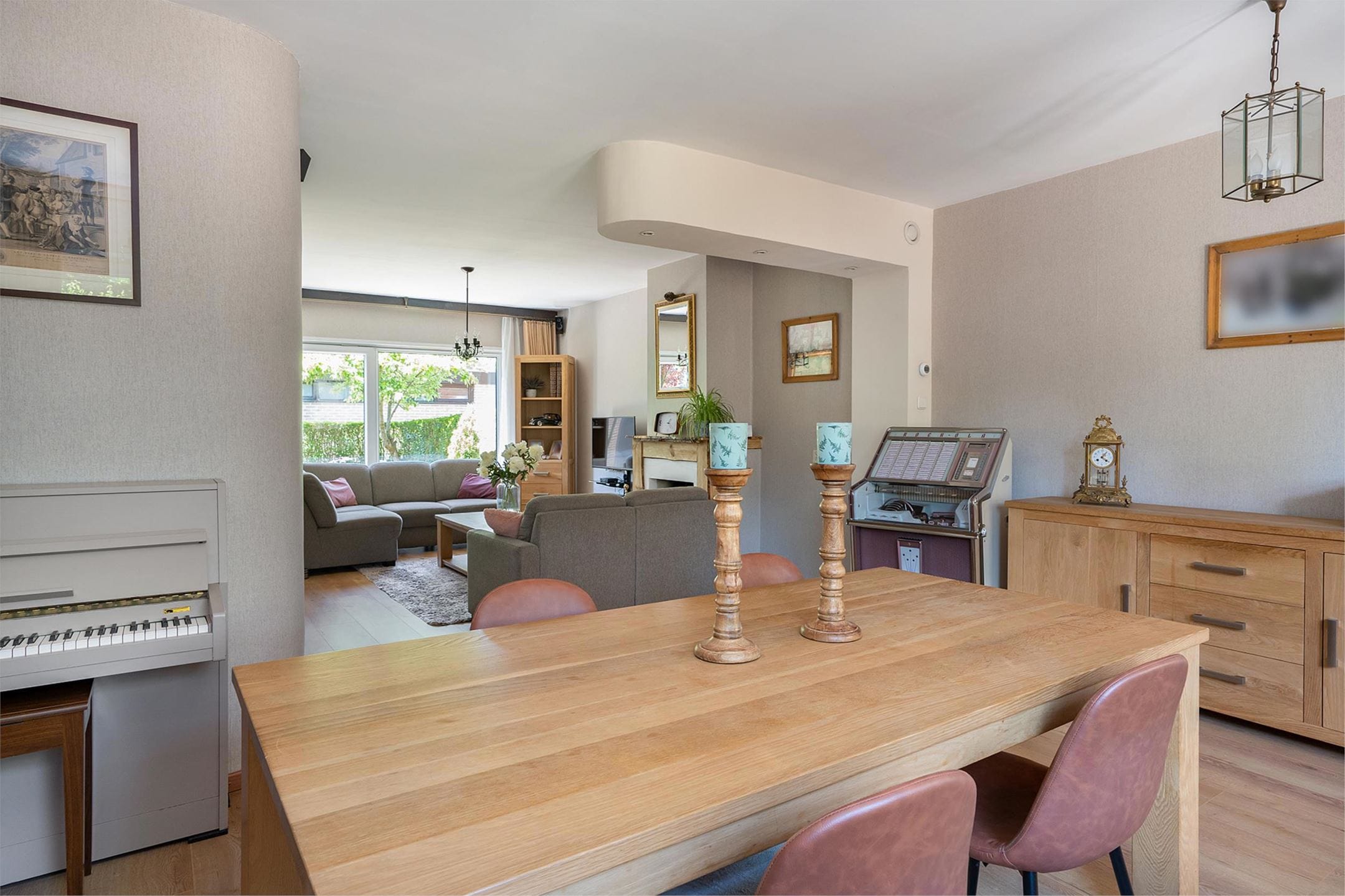 Zodra de voordeur geopend wordt leidt een hal richting de L- vormige woonkamer. Deze is voorzien van een recent vernieuwde laminaatvloer en open haard, evenals een schuifpui die toegang biedt tot de voortuin op het westen. Dit is overigens niet de enige woonkamer, want in de voormalige bijkeuken is een woonkeuken ontstaan van ongeveer 45 vierkante meter, groter dan de meeste starterswoningen in de randstad.