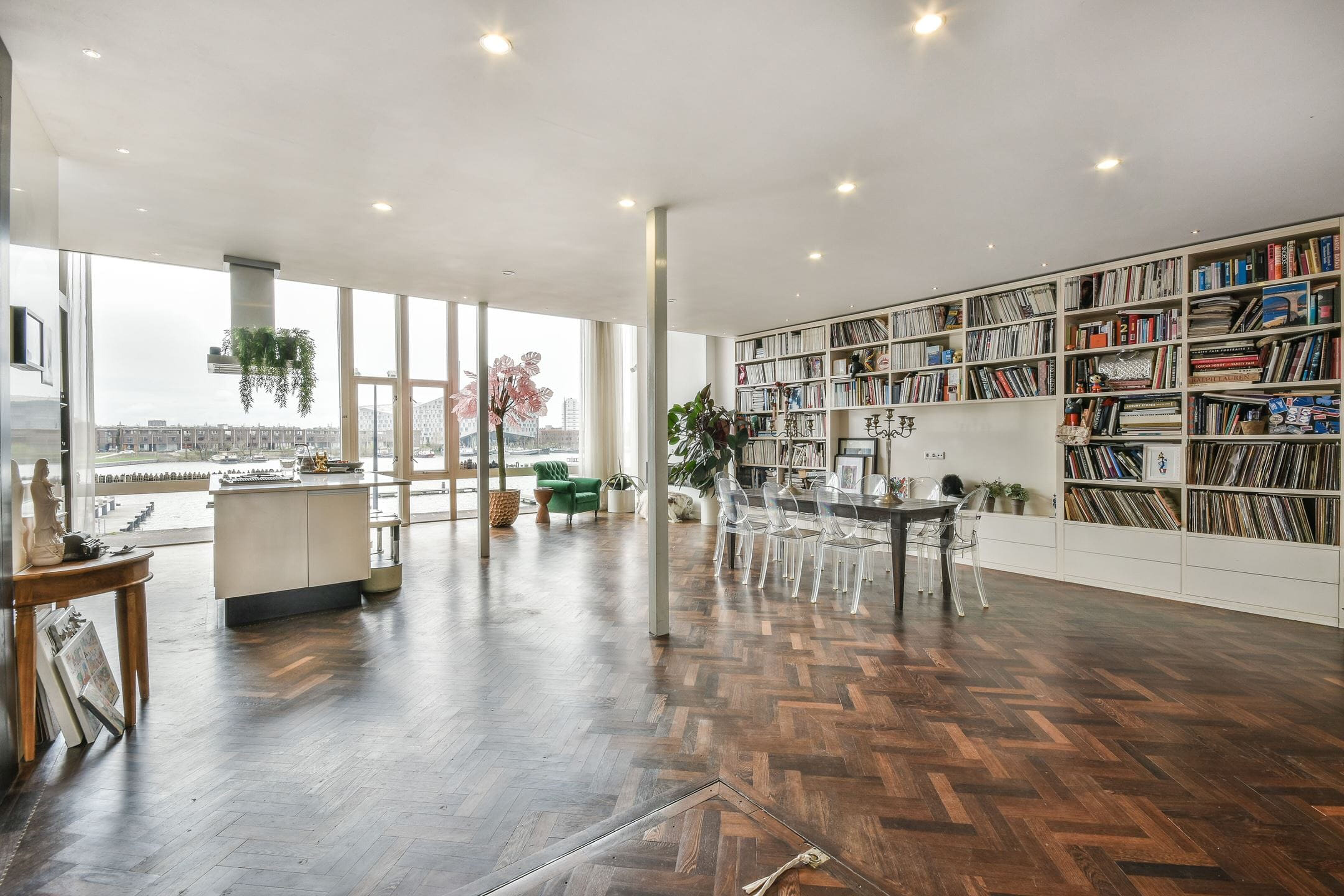 De in 2011 gerenoveerde loftwoning (gemeentelijk monument) is werkelijk uniek te noemen en heeft een vloeroppervlak van maar liefst 243 m2. De gevelbrede glaspui biedt vrij uitzicht over het water. De woning is te betreden via een trap en een elektrisch bedienbaar luik, terwijl een gashaard sfeer toevoegt aan de woon/eetkamer toe. De op maat gemaakte, open keuken met kookeiland voelt ruimtelijk aan vanwege de plafondhoogte van meer dan 6 meter.